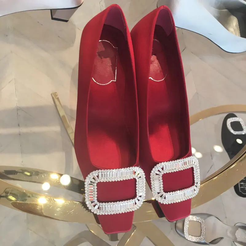 Новинка 2020 года; свадебные туфли Красного цвета на высоком квадратном каблуке со стразами и пряжкой в европейском стиле; женская обувь на толстом каблуке; атласные туфли-лодочки