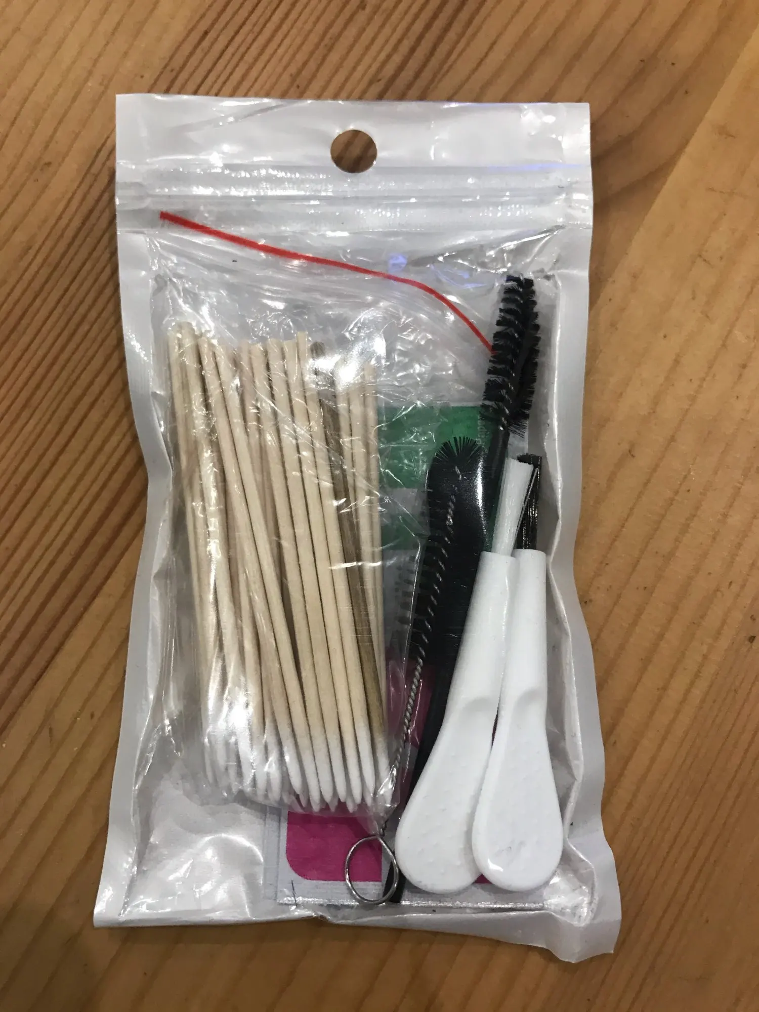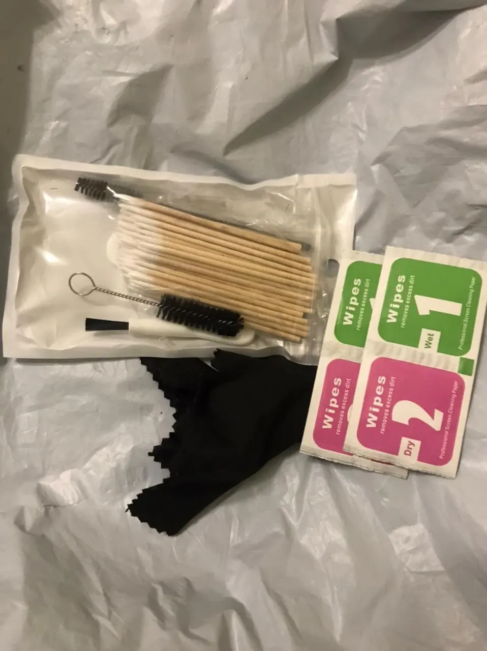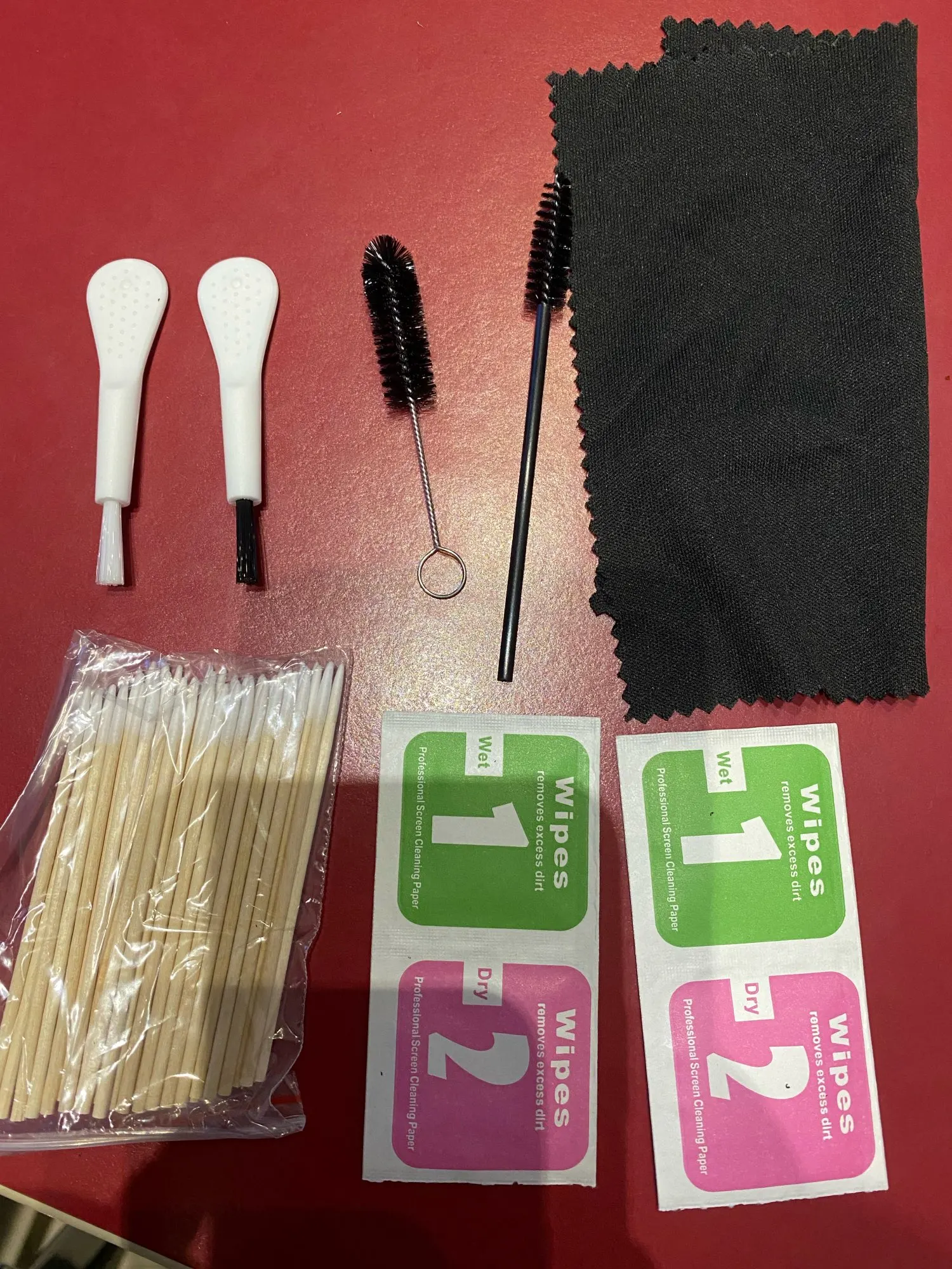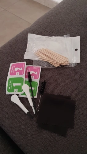 Полный набор. Все имеющиеся детали указанные на фото получены. Чистить удобно. Рекомендуем всем. Качество хорошее. Доставка быстрая. Очень. Пригодится для наушников. Нужная вещь. Берите все