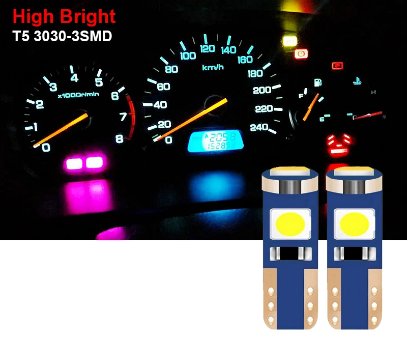 Светодиодный Тип: 3 Picecs супер яркий 3030 SMDСветодиодный Цвет: белый/красный/желтый/синий/голубой/зеленый/розовыйТип разъема: T5 светодиодный W3W W1.2WНапряжение: только 12 ВСовместим с: T5 17 18 27 37 58 70 73 74 79 85 86 206 207 286 306 307 308 406 407 2721... (только для справки)