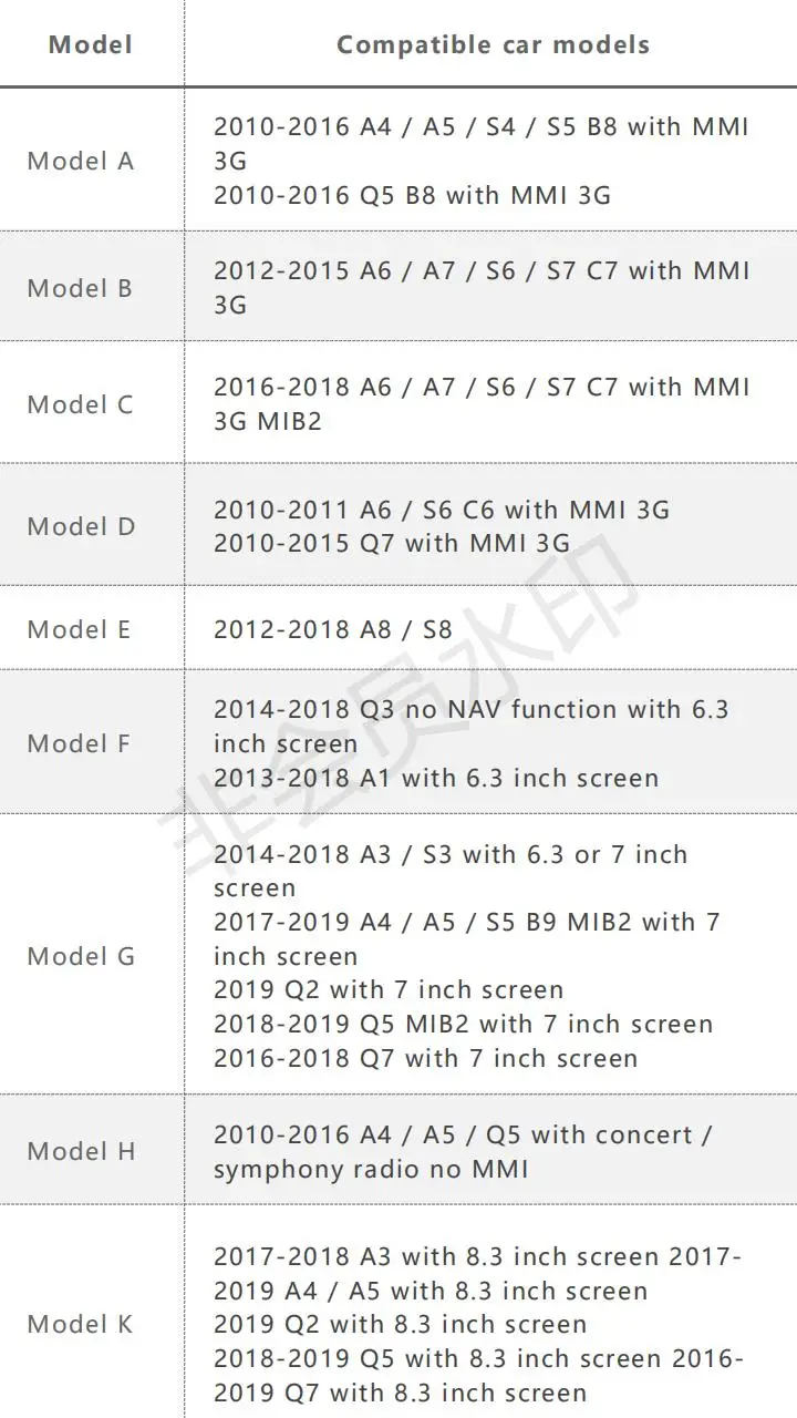 Эта беспроводная коробка декодера carplay совместима с Audi Mib2, mmi3g +, mmi3g low, mmi2g high, mmi2g low, не mmi большинство моделей AudiВы можете спросить нас, не можете ли вы найти свою модель в нашем списке.