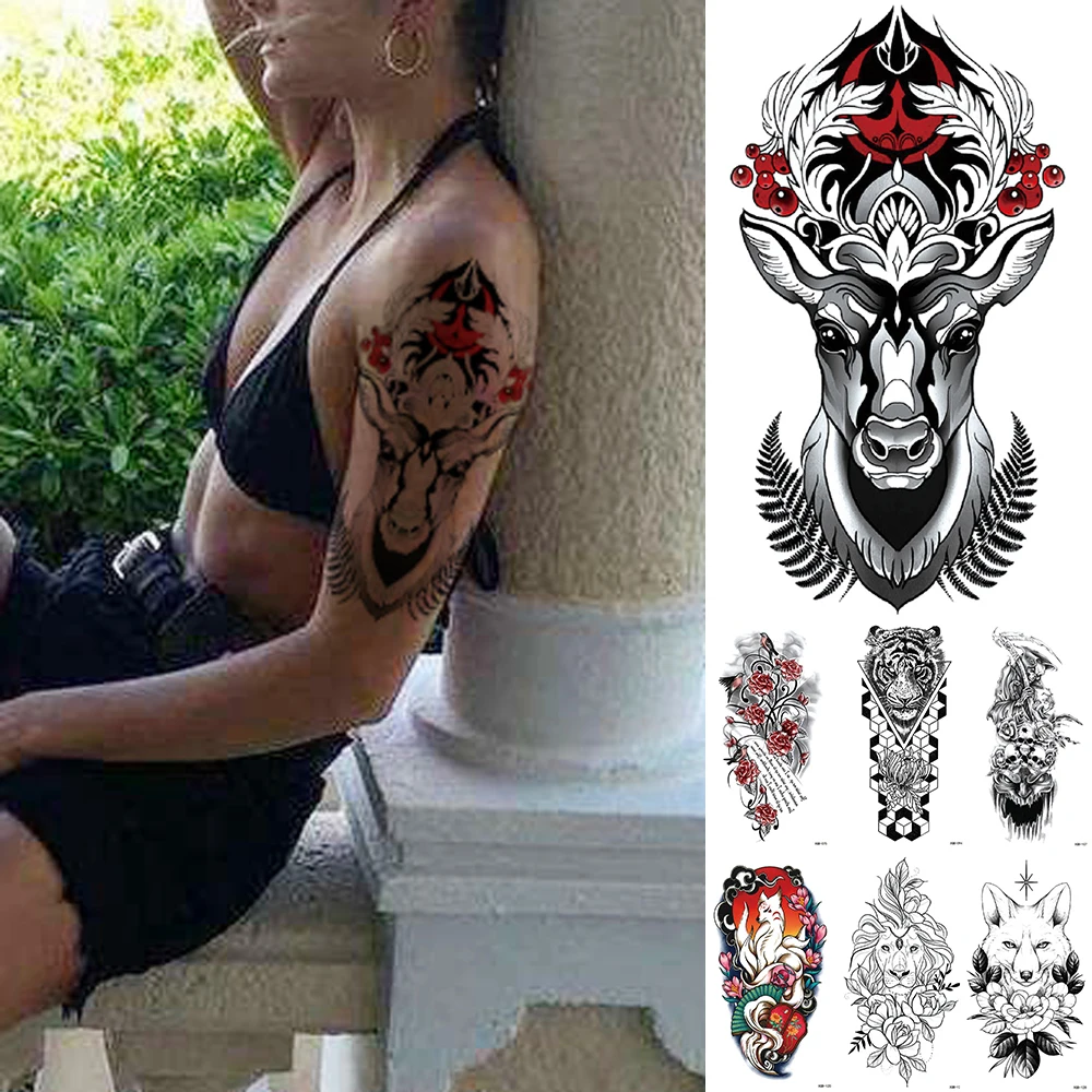 Временная тату-наклейка с оленем, водостойкая татуировка с имитацией роз и смерти, тигр, Лев, тотем, боди-арт на руку, искусственные татуировки для женщин и мужчин, 1 шт.