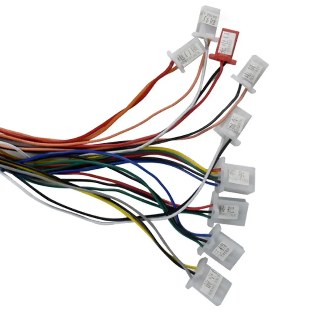 Разъем:1. Красный и черный (большой кабель): подключение батареи2. Желтый и синий: соединения двигателя3. Красный и синий: клавишный переключатель (Блокировка питания)(Если нет дверных замков питания, красное соединение с синим)4. Желтый и черный: тормоз5. Красный и желтый: тормозной светильник6. Красный и черный (маленький кабель): световой светильник7. Красный, черный и синий: регулятор скорости 1-4 в (дроссельная заслонка)(Красный: + 5 В, черный: - , синий: сигнальный провод)8. Красный и черный (маленький кабель): зарядное устройство