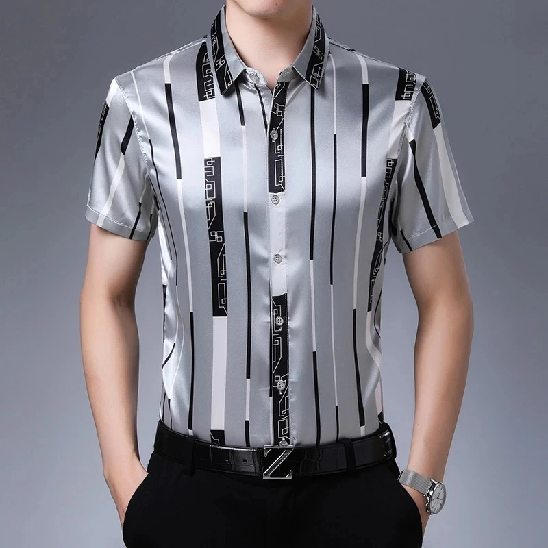 Мужская шелковая одежда, весенние полосатые шелковые рубашки с длинным рукавом, мужские повседневные классические рубашки