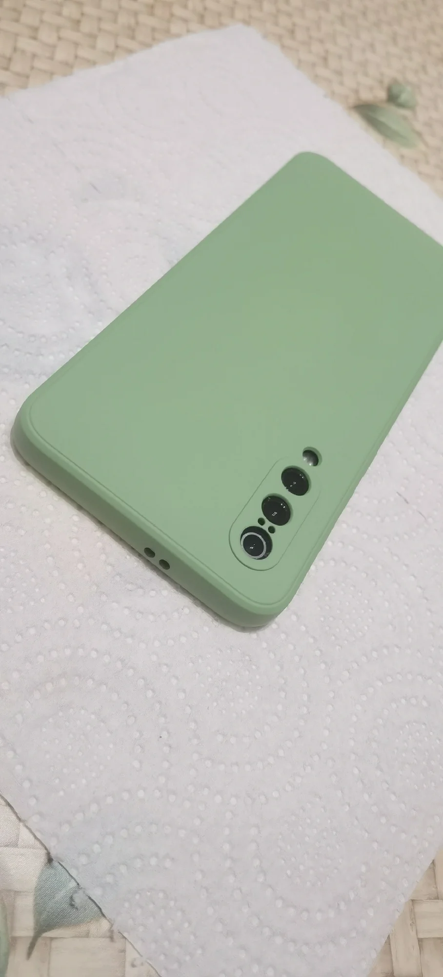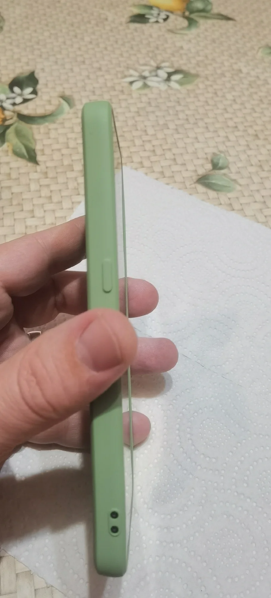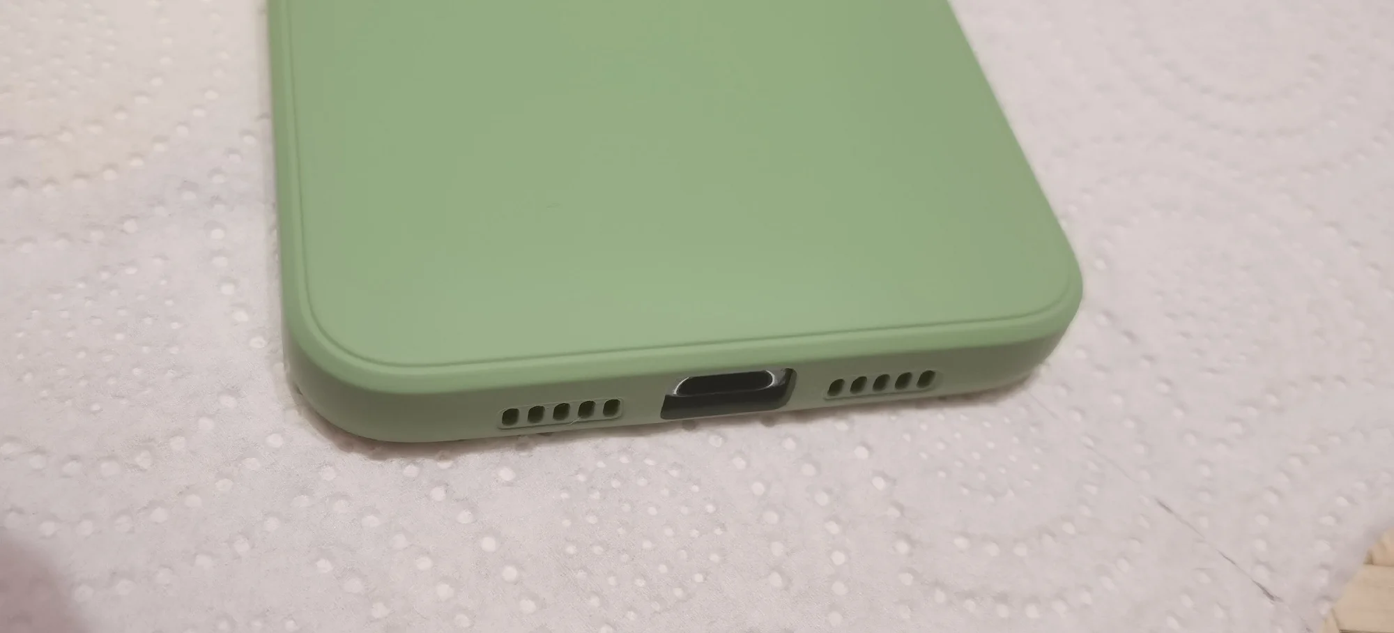 в описание силикон, на деле жесткая резина, скорее окрашена, цвет на фото в объявление ярче и приятней, на деле бледно зеленый цвет, наклеина псевдо замша внутри. По ощущениям чехол маленький, задумка производителя дизайн IPhone , прямы, рубленные края, а по факту торцы скошенные, уголки приподняты.