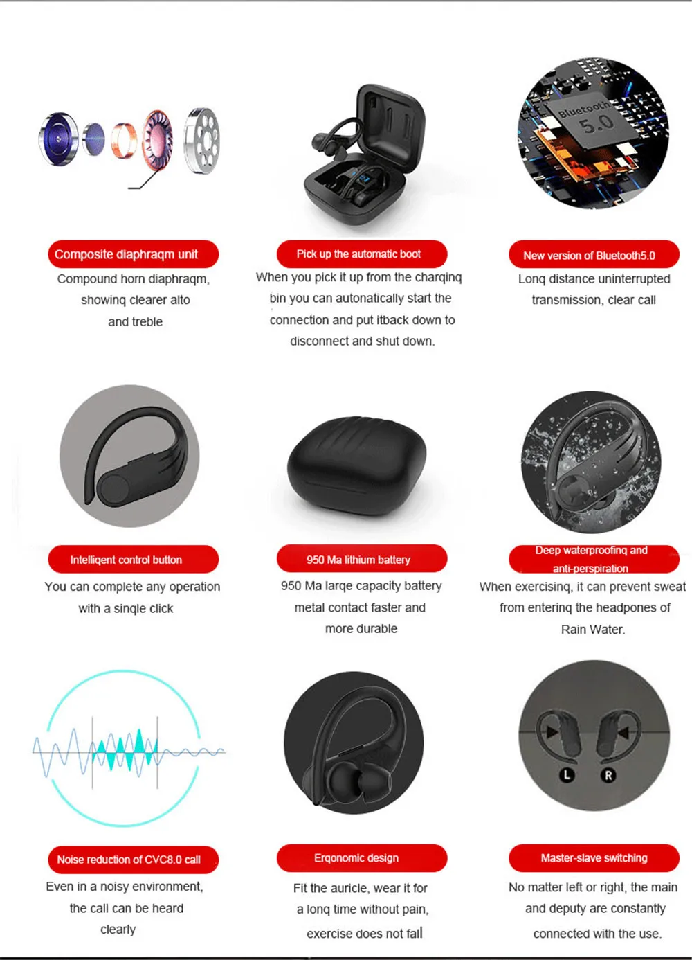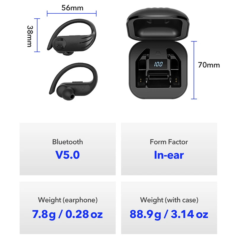 B1 TWS Bluetooth-гарнитура со светодиодный ным дисплеем, Беспроводные стереонаушники, водонепроницаемые наушники с шумоподавлением и микрофоном Версия Bluetooth: V5.0 + EDR Частота беспроводной связи: 2,402-2,480 ГГц Вспомогательное соглашение: HFP1.7/A2DP1.3 // AVRCP1.6/SPP1.2andPBAP1.2, BDR/BLE Дальность передачи: 10 метров Емкость аккумулятора: 100 мАч Напряжение/ток зарядки: 5 В/1 А Время воспроизведения/разговора: около 10 часов Время зарядки: около 2 часов Время в режиме ожидания: 120 часа Сопротивление динамика: φ 8 мм 32 Ом Чувствительность микрофона: -42 дБ Рабочая температура: -10-50 °C Вес брутто: 4 г * 2