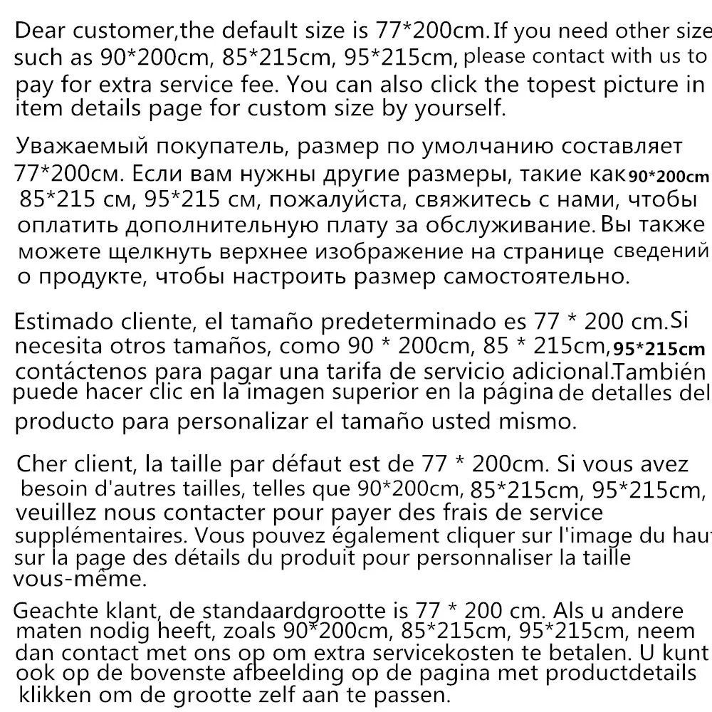 1. Размер продукта: Размер A: 77 см * 200 см/30,31 дюйма * 78,74 дюйма (1 комплект = 2 шт. * 38,5 см * 200 см) Размер B: 85 см * 215 см/33,46 дюйма * 84,65 дюйма (1 комплект = 2 шт. * 42,5 см * 215 см) Размер C: 90 см * 200 см/35,43 дюйма * 78,74 дюйма (1 комплект = 2 шт. * 45 см * 200 см) Размер D: 95 см * 215 см/37,40 дюйма * 84,65 дюйма (1 комплект = 2 шт. * 47,5 см * 215 см) Примечание: A) наклейка была разрезана на две части из-за задержки международной доставки. Вам нужно собрать их самостоятельно. Б) мы можем предоставить услугу нестандартного размера, если вам нужен другой размер, пожалуйста, свяжитесь с нашим сервисным центром для заказа.