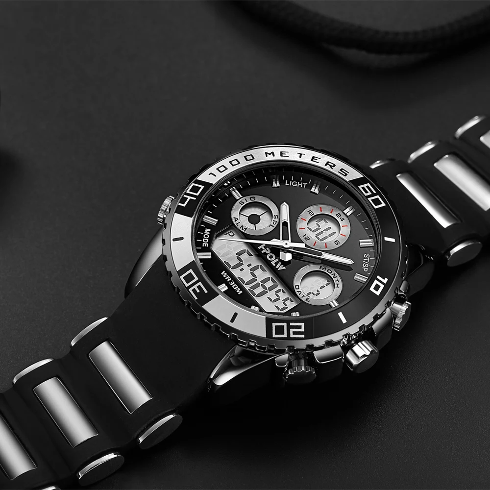 Часы наручные мужские кварцевые с хронографом, цифровые светодиодные, водонепроницаемость 30 м, спортивные, с серебристым и черным ремешком