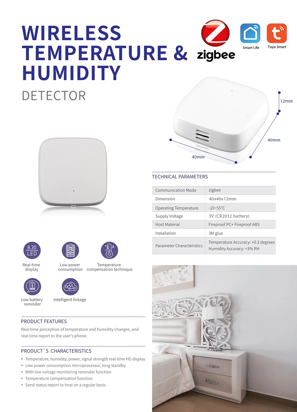 Примечание: умный датчик ZigBee Tuya T & H должен работать с шлюзом Tuya, который поддерживает протокол ZigBee. Он не может работать без интеллектуального шлюза Tuya ZigBee.Особенности:* Датчик T & H определяет температуру и влажность в окружающей среде во времени, и ЖК-экран динамический дисплей в реальном времени значения (tem., hum., емкость батареи, WIFI сигнал). Обеспечивает комфортную температуру и влажность.* С шлюзом и облачной платформой, восприятие изменений температуры и влажности и отчет в реальном времени для пользователей телефона. Вы можете просматривать текущие и текущие данные о температуре и влажности.* Приложение дистанционное управление связью сцена, когда температура и детектор влажности проверить температуру слишком жарко, он будет связываться с домашней автоматизации для управления кондиционер ВКЛ или ВЫКЛ.* Вы можете подключить датчик к смарт-розетке, если обнаружена слишком низкая влажность, он может включить розетку и включить увлажнитель.* Его также можно комбинировать с другими устройствами для разработки и реализации сценариев смарт-приложений. Ультра-быстрая реакция, защита от помех, сверхнизкое энергопотребление и экономичность.* Простота установки, установка с помощью винта или двустороннего клея, чтобы легко зафиксировать его на стене.Характеристики:Тип: датчик T & HИсточник питания: 2 * AAA (не входит в комплект)Датчик относительной влажности: ± 3% RH (макс.)Высокая точность Температура Сенсор: ± 0,3 °C (макс)От 0 до 100% рабочий диапазон RHРабочий диапазон до-40 до + 85 °CЦвет: белыйМатериал: АБС-пластикРазмер изделия: 68*68*30 ммВес изделия: 72 гРазмер посылка: прибл. 10*9*6 см/3,9*3,5 * 2.4inВес посылка: прибл. 85 г/3 унцииУпаковочный лист:1 * Датчик температуры и влажности