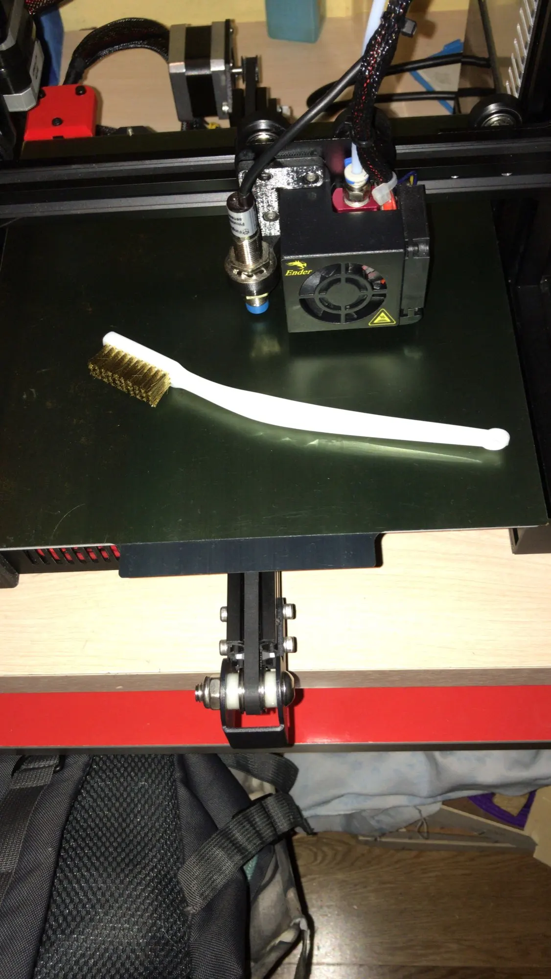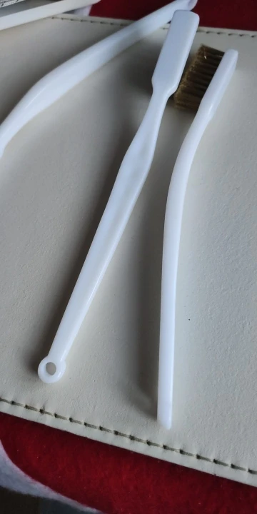 Прочная ручка удобно изогнута, щетина ровная и густая, чистит всякую дрянь с сопла принтера отлично.