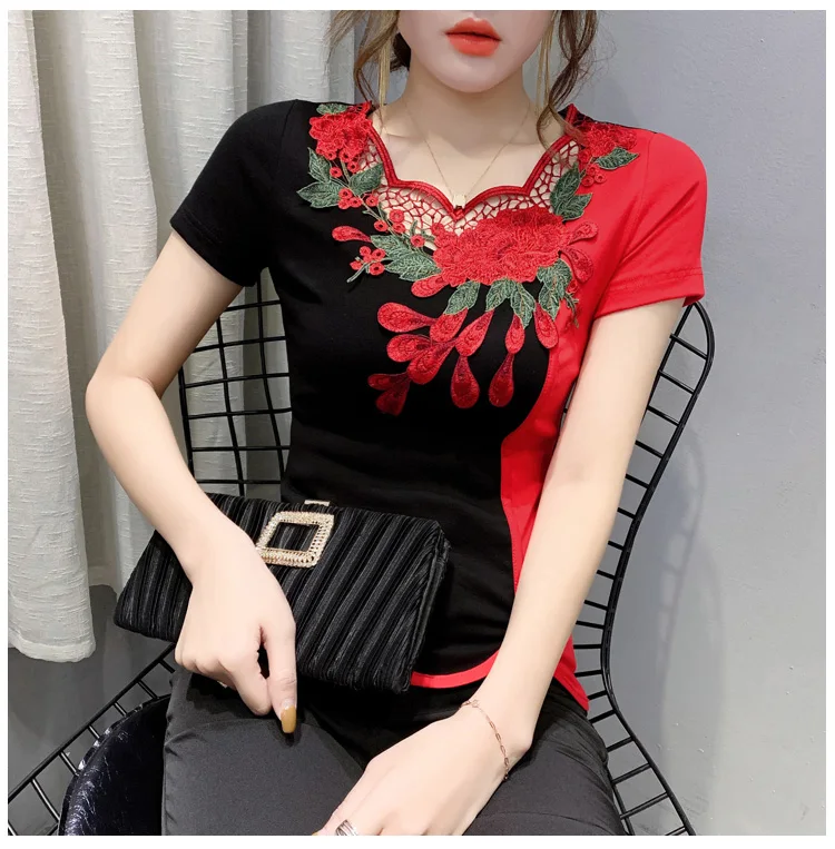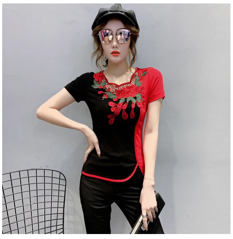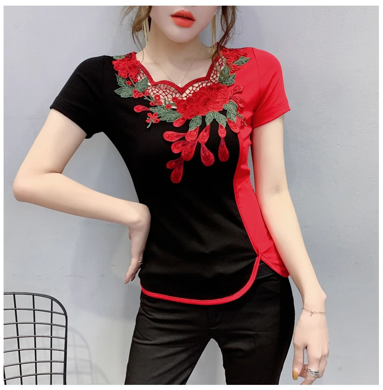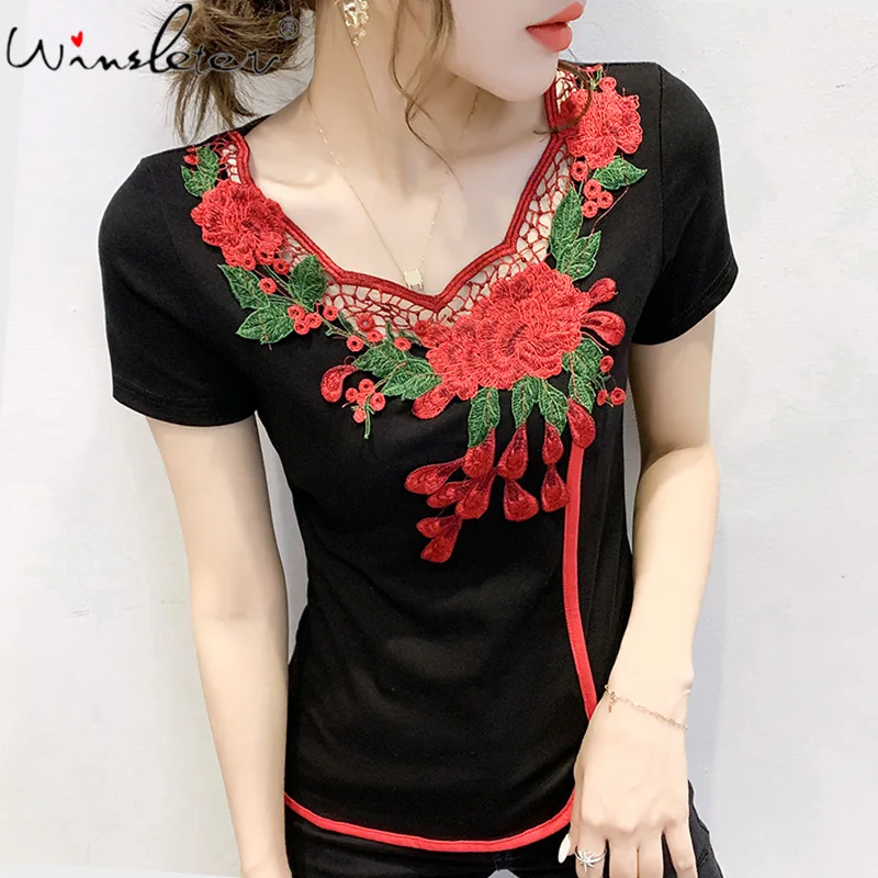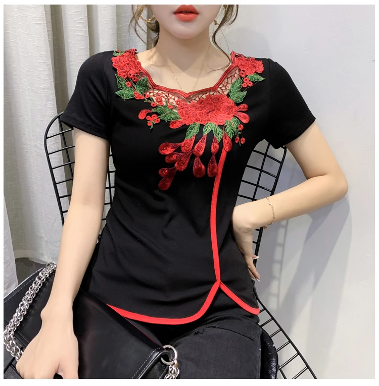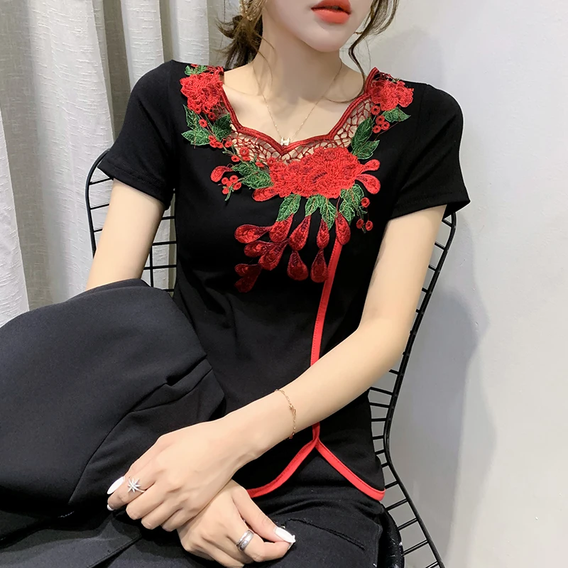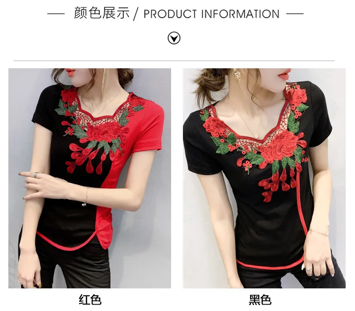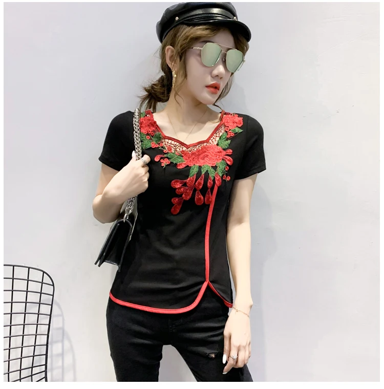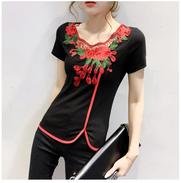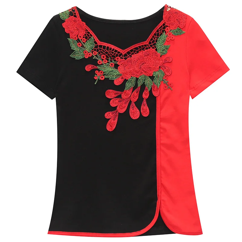 Женские хлопковые футболки, новинка 2020, футболки с коротким рукавом и круглым вырезом, летние китайские Цветочные Футболки с вышивкой для шоу, T03607B