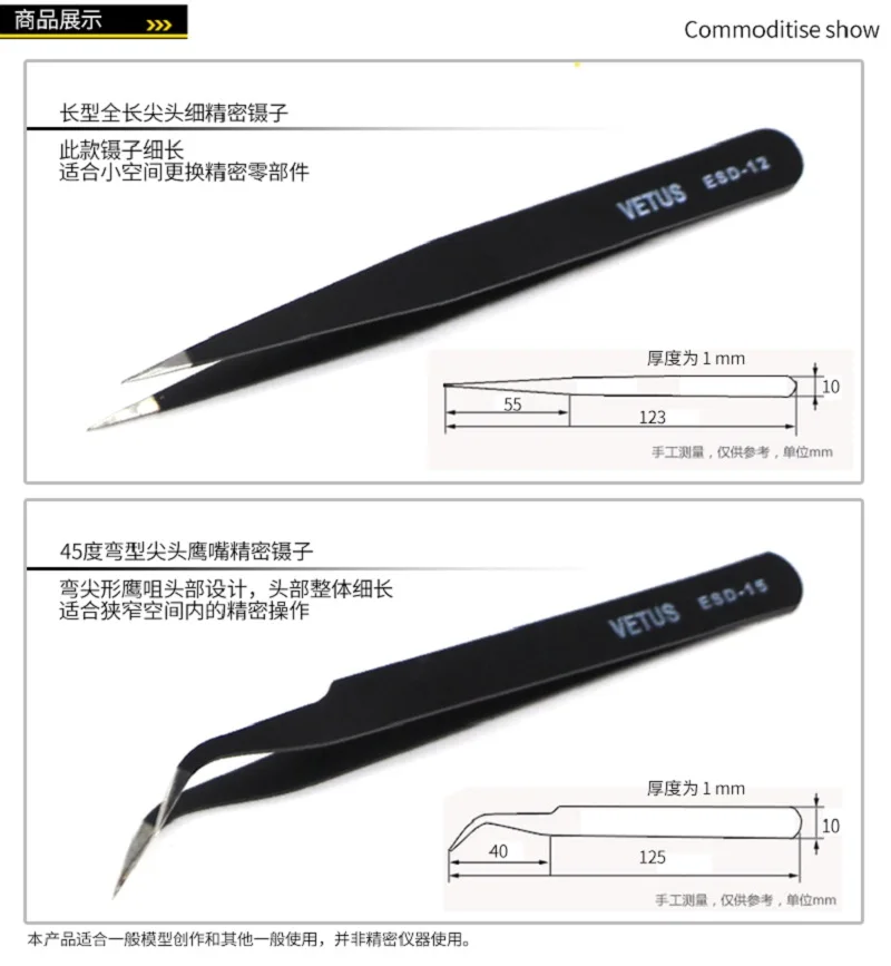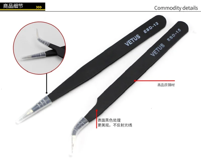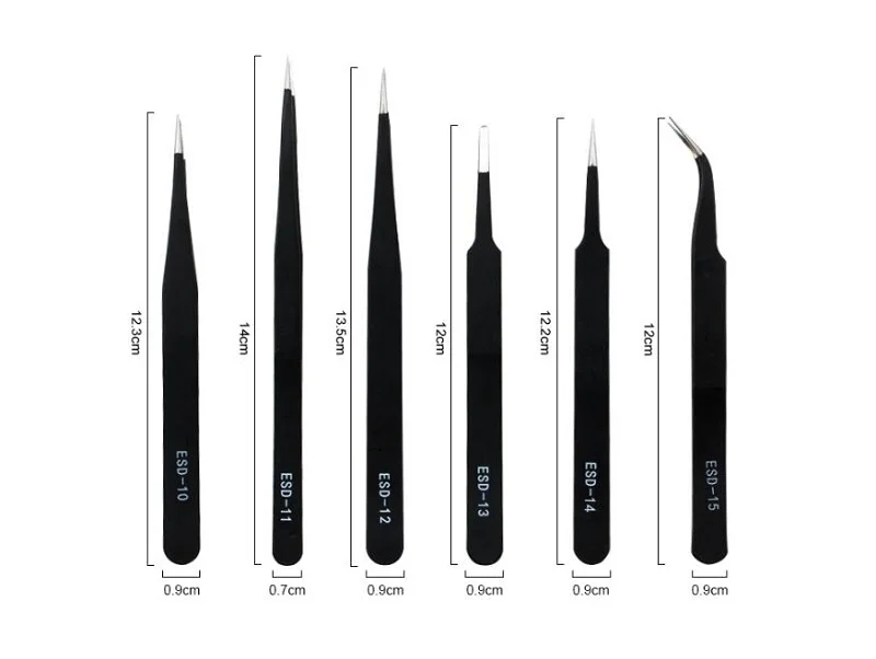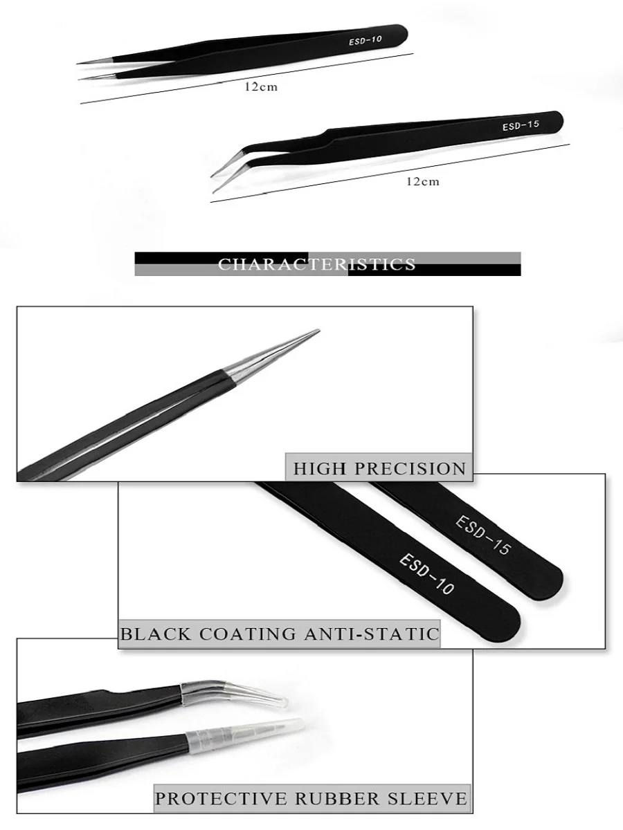 Размеры: 12 см + 12,5 см Комбинации выбор: ESD-15 + ESD-12 (более длинные пинцеты) ESD-15 + ESD10 (длина прямого пинцета короче) Цвет: черный/цвет насыщенный/золотой Вес нетто: 15,5 г Материал: нержавеющая сталь