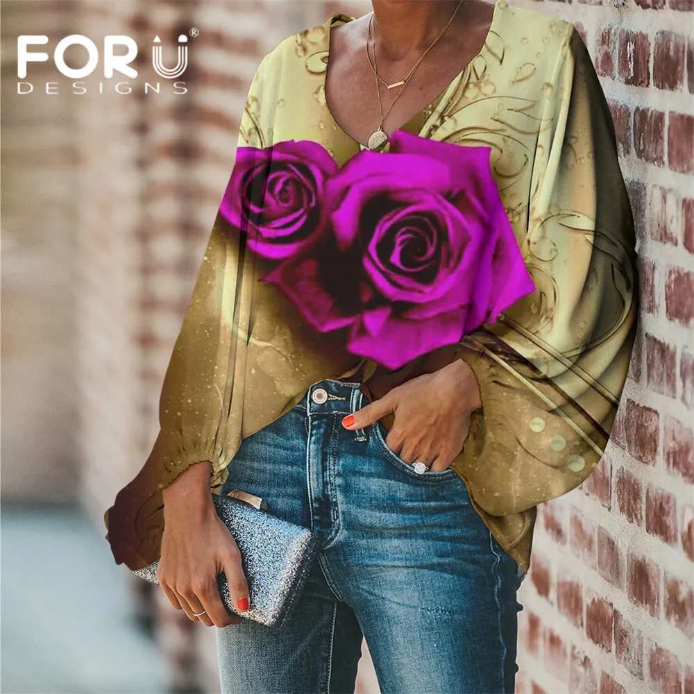 FORUDESIGNS, женская одежда, свободные размера плюс, Женские топы и блузки, Повседневная рубашка в стиле Харадзюку С 3D цветочным принтом роз, на лето