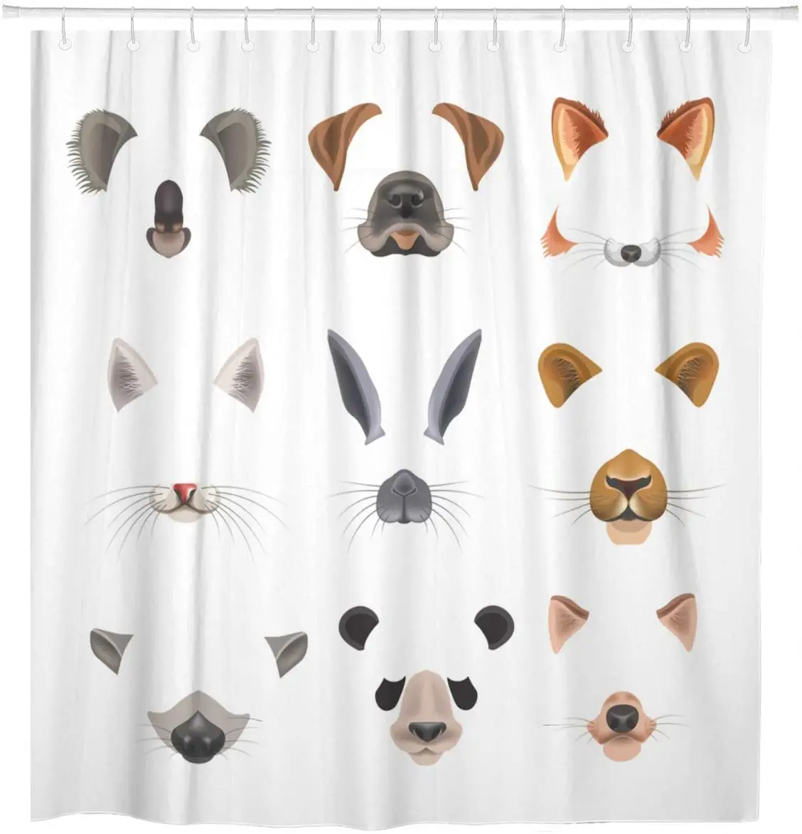 Занавеска для душа из полиэстера, с плоскими узорами, с изображением мордочек животных, водонепроницаемая, 72x72 дюйма, с крючками, для видеочата