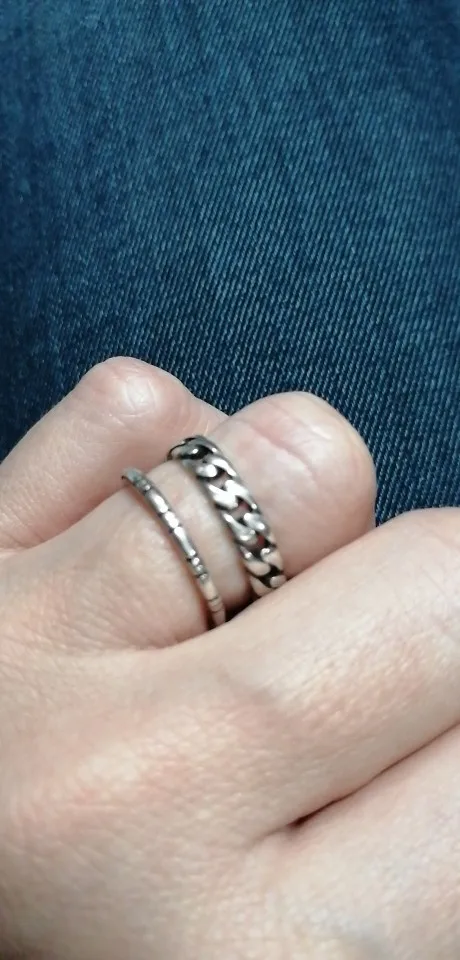 Отличные кольца! Самым большим по размеру (сжатым) оказалось из круглых шариков. А самым маленьким - с круглым шаром по центру. В общем не у всех колец одинаковый размер в сжатом даже виде) Один раз успела надеть - ничего не изменилось. Качество отличное. Но могут не сочетаться друг с другом из-за разного цвета металла!)