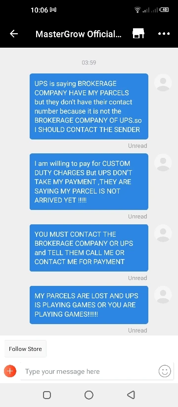Никогда не покупайте на ALIEXPRESS по всему воздуху. Я заплатил 230,00 евро продавцу «MASTERGROW SHOP» за то, что я никогда не получил, он дал мне номер отслеживания UPS, но UPS говорит, что у них еще нет посылки. И ALIEXPRESS никогда не вернет деньги. Стыд за то, что вы «ALIEXPRESS» не помогли своим клиентам вернуть деньги или решение. Я отправил все доказательства на ALIEXPRES, но в VAI N.I заказал из Польши, чтобы избежать таможенных сборов, но они отправляются из Китая, и я все еще готов оплатить пошлину, но посылки никогда не поступали! Позор на вас ALIEXPRESS и MASTERGROW. Обман