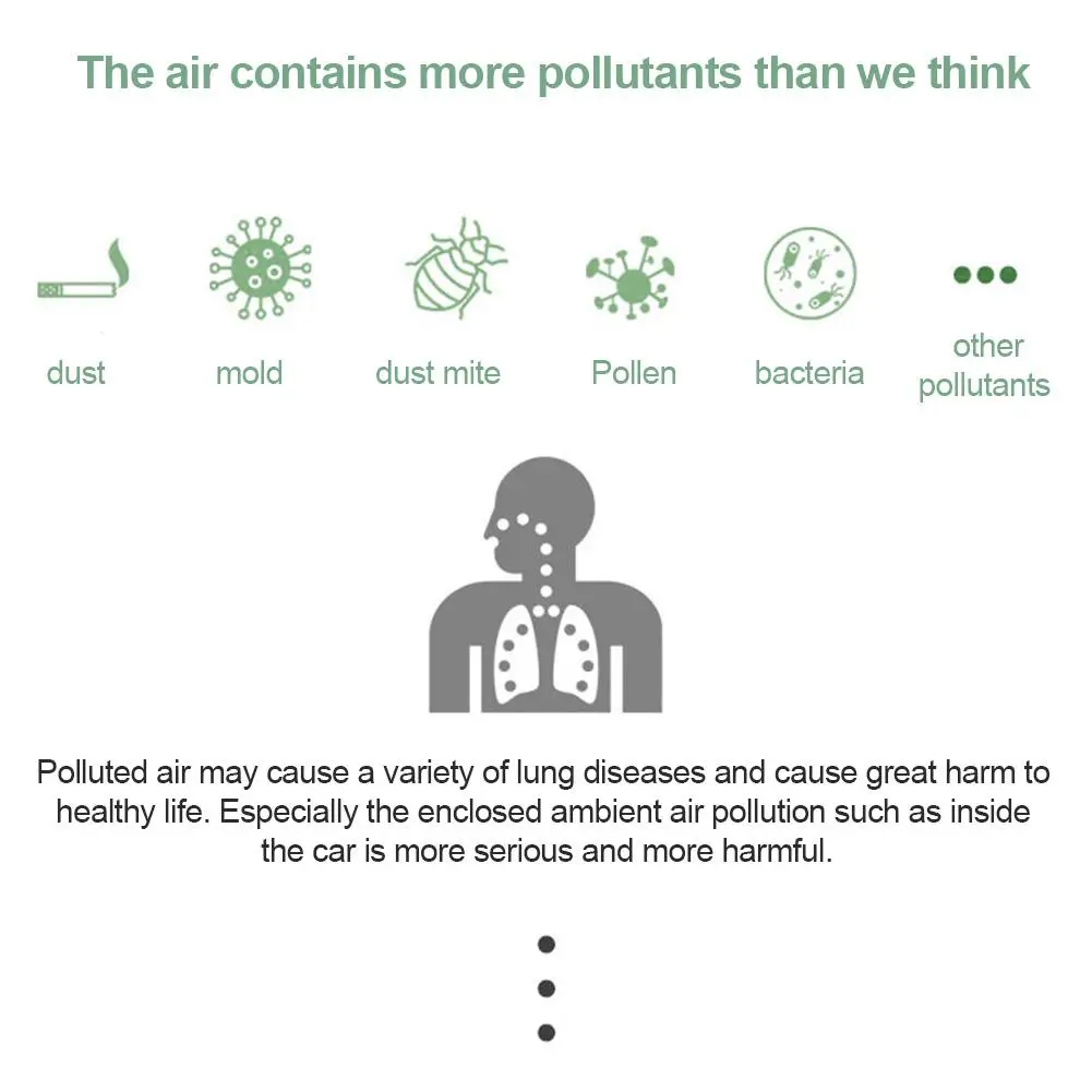1. Большой вред для здоровья: загрязненный воздух может вызвать различные болезни легких, которые причинят большой вред здоровой жизни, особенно замкнутое загрязнение окружающего воздуха, например, внутри автомобиля, является более серьезной и более вредной.2. Портативные автомобили: если вы долгое время сидите в закрытом помещении, вы будете знать важность получения свежей циркуляции воздуха. Чистый воздух не подходит для дома, поэтому мы включаем автомобильный адаптер постоянного тока 12 Вольт, чтобы вы могли очистить воздух, куда бы вы ни отправились.3. Бесшумная работа: сидя на кровати ночью во время прослушивания громкого звука очистителя воздуха? Никогда не снова! Режим сна имеет максимальный рабочий шум всего 22 децибел и поэтому даже тише, чем секрет4. Умный датчик качества воздуха: Этот очиститель воздуха имеет умный датчик качества воздуха и трехцветный светильник, чтобы показать качество воздуха вашей жизни. Зеленый цвет указывает на хороший воздух, желтый-на умеренный воздух, красный-на повреждение воздуха.5 、 семи-этап фильтрации: 7-в-1 реальные HEPA фильтр поможет вам легко дышать, удаляя частицы, как малые 0,1 микрон. Человеческие волосы диаметром около 50 микрон, поэтому наш фильтр удаляет частицы в 500 раз меньше, чем человеческие волосы.