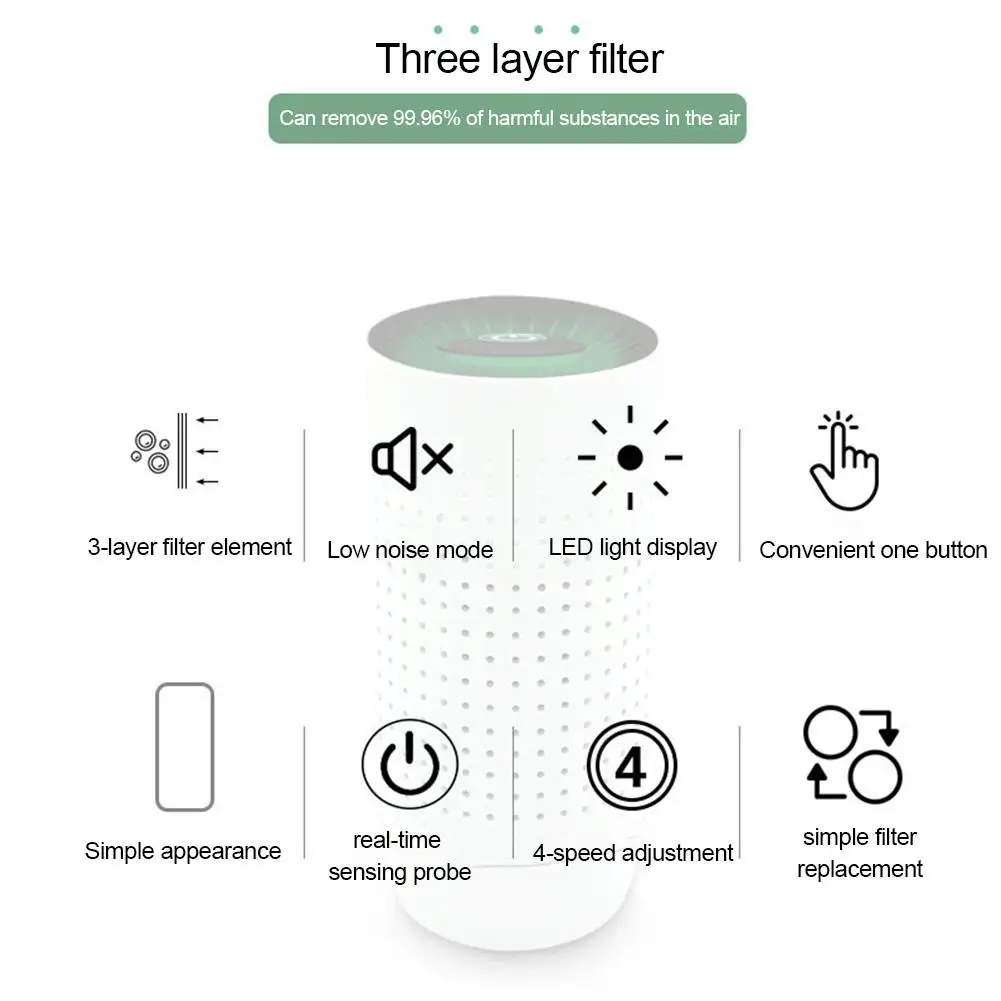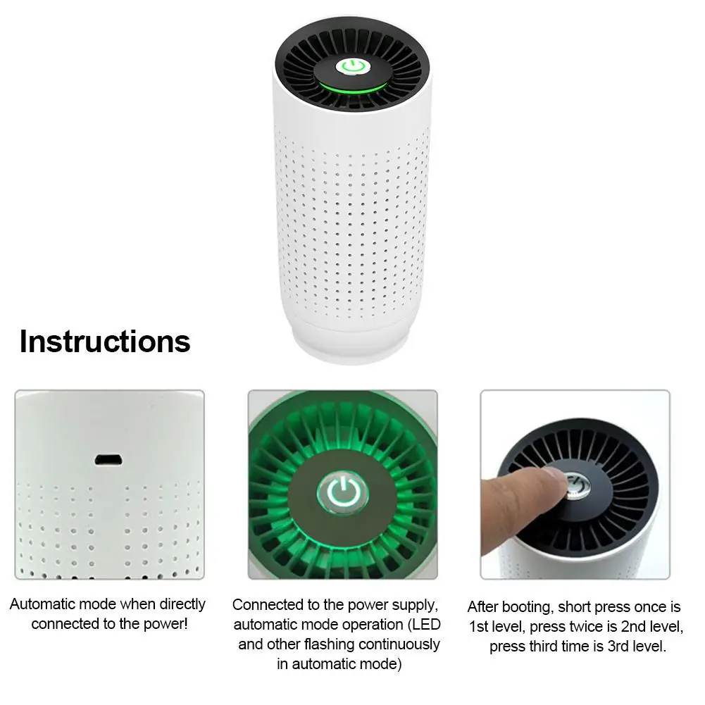 Технические характеристики:Место использования (использование не ограничено следующим списком)Семья и жилых помещенийДля офисаГаражКладоваяНаименование товара: маленький очиститель воздухаМетод очистки: 3 композитных фильтраСрок службы фильтра: нормальное использование 3-6 месяцев (в зависимости от условий использования, срок службы фильтра отличается)Мощность: 5 В постоянного тока/1 А USBЗона применения: 3-8m2Мощность: 3,5 WРазмеры: около 70x150mm/2,76 * 5.91inМатериал: АБС-пластикОбъем воздуха: 3 уровняФильтрующий элемент: H13