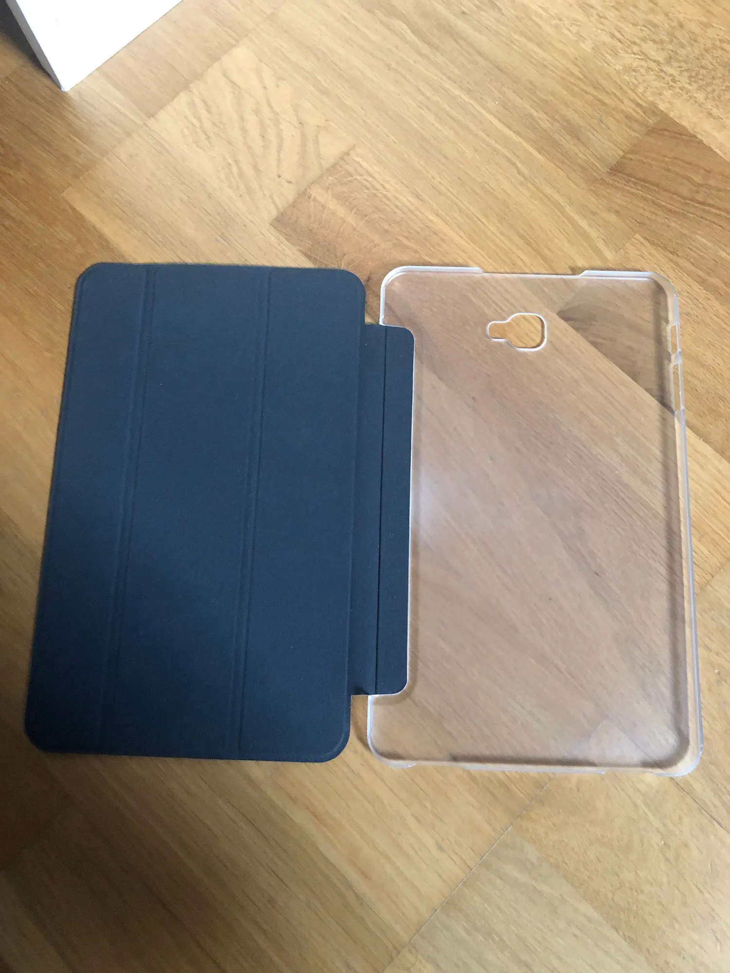 Плотный, прочный чехол, задняя панель прозрачная. На Samsung galaxy tab10 проблема с магнитной крышкой, если ее завернуть назад и при ее приближении к оборотно, планшет отключается