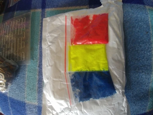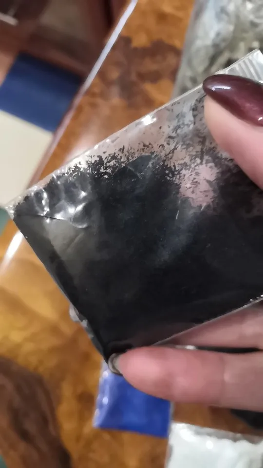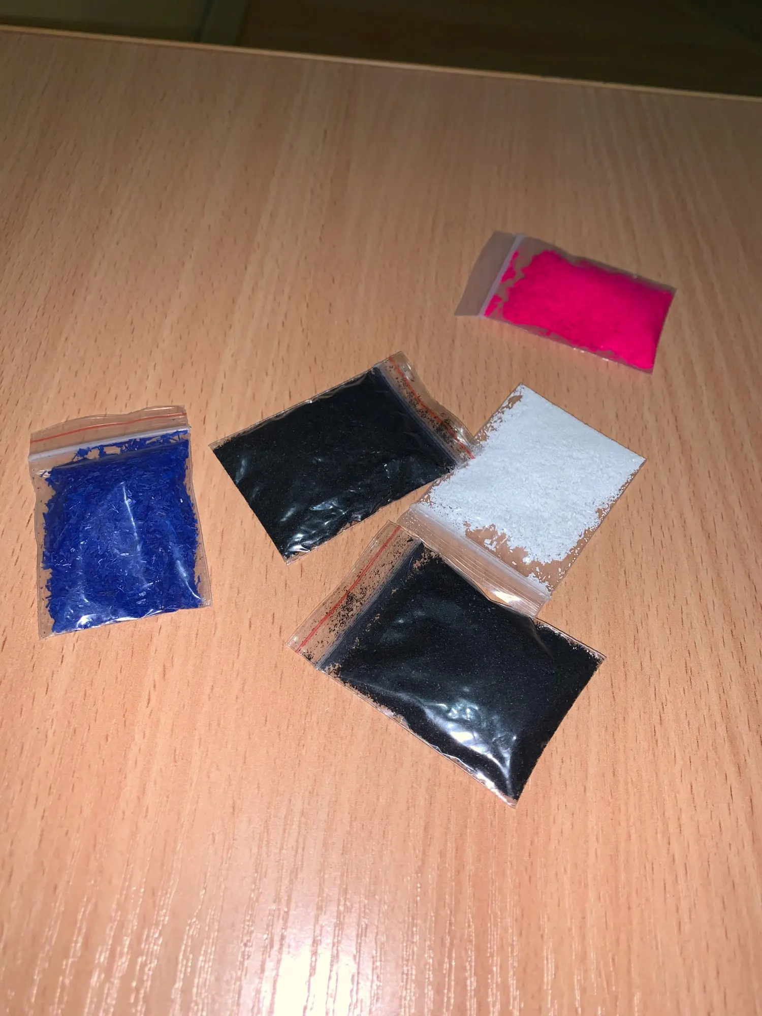 Первый раз пробовала пигменты, получилось смешать не сразу. Синий - очень насыщенный, достаточно небольшой щепотки для яркого цвета. Могу порекомендовать сыпать совсем чуть чуть и долго размешивать, так как пигмент оседает на дне емкости. Белый не совсем понравился, нужно много сыпать для насыщенности. Черный долго растворялся. Возможно это из-за моей неопытности