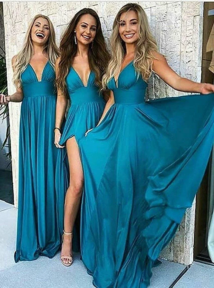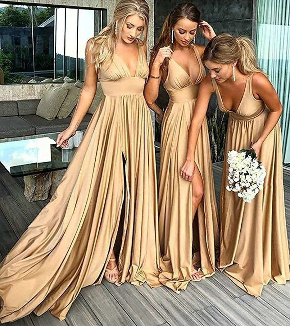 Особенности: Элегантные Простые платья для подружек невесты с разрезом сбоку, двойным v-образным вырезом, длиной до пола, без рукавов, открытой спиной/открытой спиной, завышенной талией, бюстгальтером, а-силуэтом, молнией сзади.