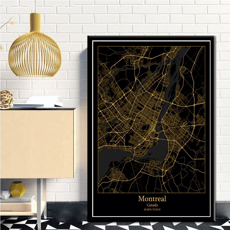 Монреаль, Канада, черный и золотой город светильник Карты изготовленный на заказ карта городов мира Плакаты Печать на холсте Nordic Стиль Wall Art домашний декор