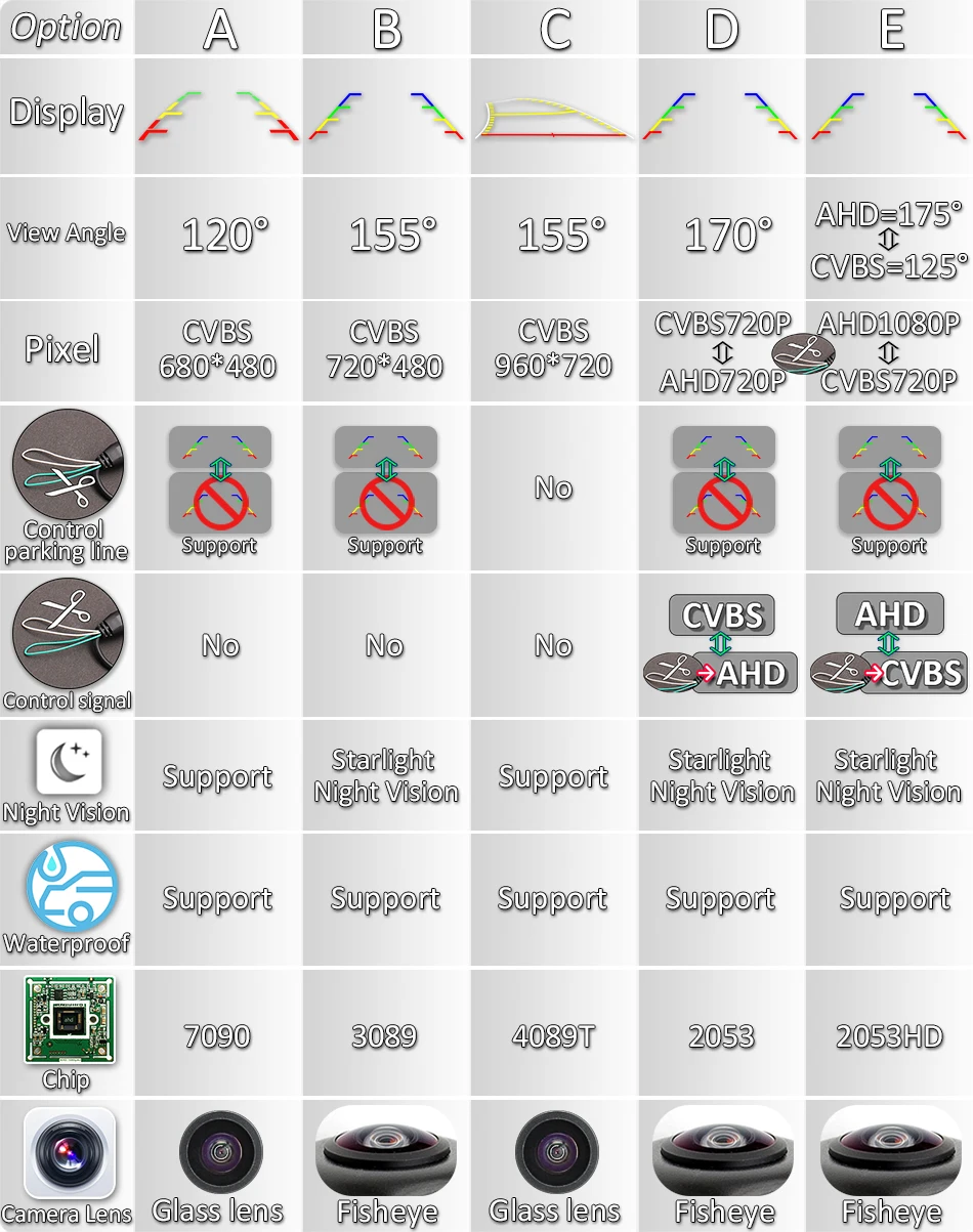С помощью управления сигналом может поддерживать CVBS и AHD дисплеи.• Камера D(CVBS )+( 1280x720 )+( 170 °)Отрежьте белый кабель →( AHD )+( 1280x720 )+( 170 °)• Камера E(AHD1080P )+( 1920x1080 )+( 175 °)Отрежьте белый кабель →( CVBS )+( 1280x720 )+( 125 °)