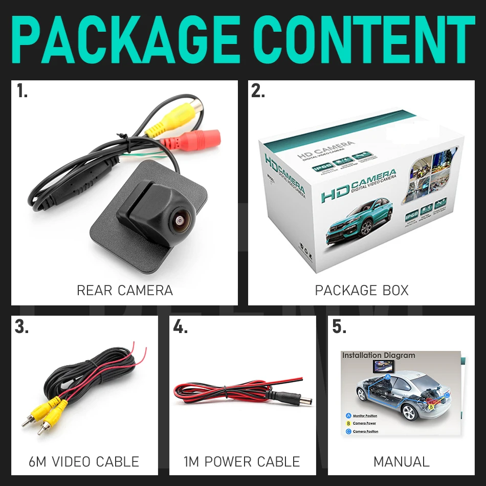 1. Задняя камера2 посылка3. Видеокабель (6 м)4. Кабель питания5. Руководство