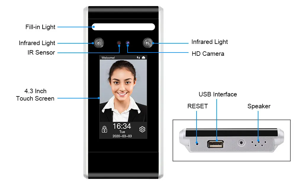 1) 4,3 дюймовый TFT LCD цветной экран. Изготовлен из высококачественного материала.2) Работа с 12 В постоянного тока.3) обладает инфракрассветильник том ночного видения высокого разрешения и профессиональным цветом Двойная камера, может провести быструю проверку в любых условиях.4) Двойной источник светильник (2 инфракрасных луча + светильник). Можно распознать даже в темноте.5) скорость идентификации 0,1 с, очень быстрая! Поддержка расстояния распознавания лица 0,5-2 метра.6) работает как с частотой 125 кГц, так и с частотой 13,56 мгц. Поддержка карт EM и Mi-fare.7) Поддержка 2000 лиц, 2000 паролей, 2000 RFID-карт, 200000 записей.8) поддерживает лицо, пароль, RFID-карту и различные комбинированные методы, чтобы удовлетворить запросы разных пользователей.9) редакторы методов ввода T9, в названии машины, отделении, частоте и другой информации, могут напрямую выводить отчеты о посещаемости, очень просты в эксплуатации.10) Поддержка способа связи Wi-Fi/TCP/ IP. Поддержка загрузки данных о посещаемости загрузки USB-накопителя.11) имеет Wiegand26/34 вход/выход, TTL вход/выход, релейный выход.12) Поддержка английского меню и гуманных голосовых подсказок.13) подходит для входов и выходов из офиса, фабрики, гостиницы, школы и т. д.