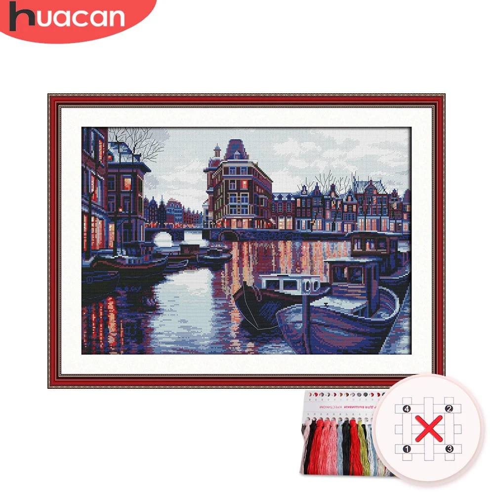HUACAN приморский город Счетный крест наборы 14ct 11ct белый холст ...