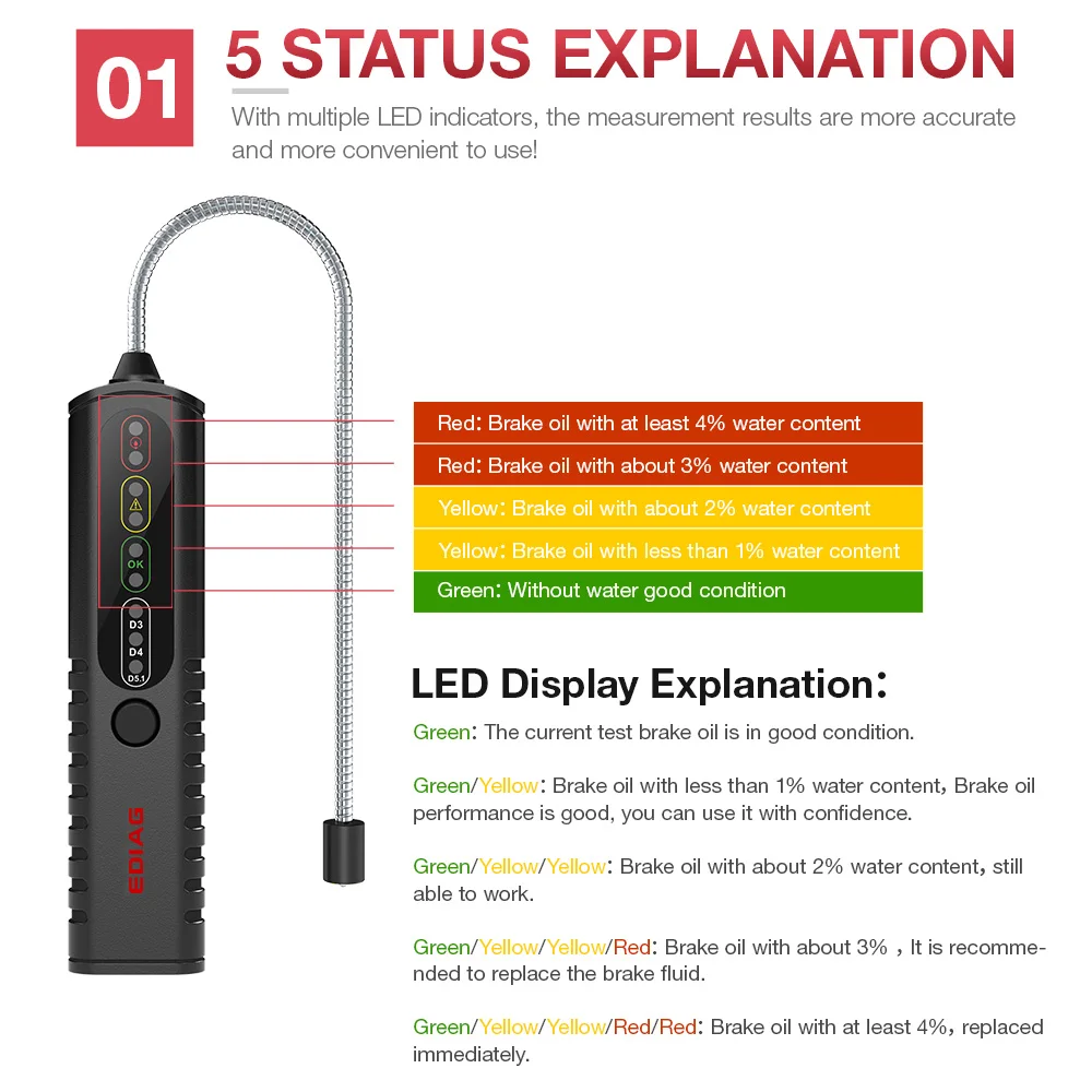 С несколькими светодиодный индикаторами результаты измерений более точные и удобные в использовании!Красный: тормозное масло с содержанием воды не менее 4%Красный: тормозное масло с содержанием воды около 3%Желтый: тормозное масло с содержанием воды около 2%Желтый: тормозное масло с содержанием воды менее 1%Зеленый: без воды хорошее состояние