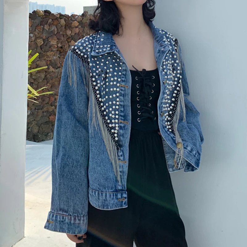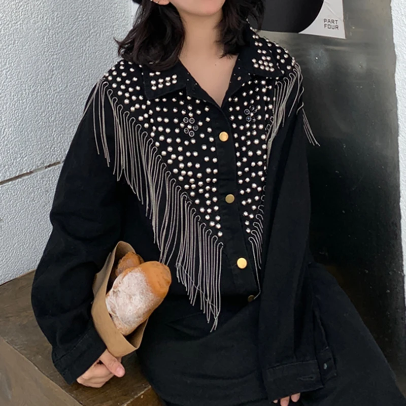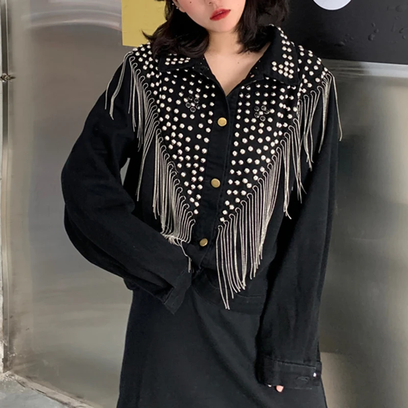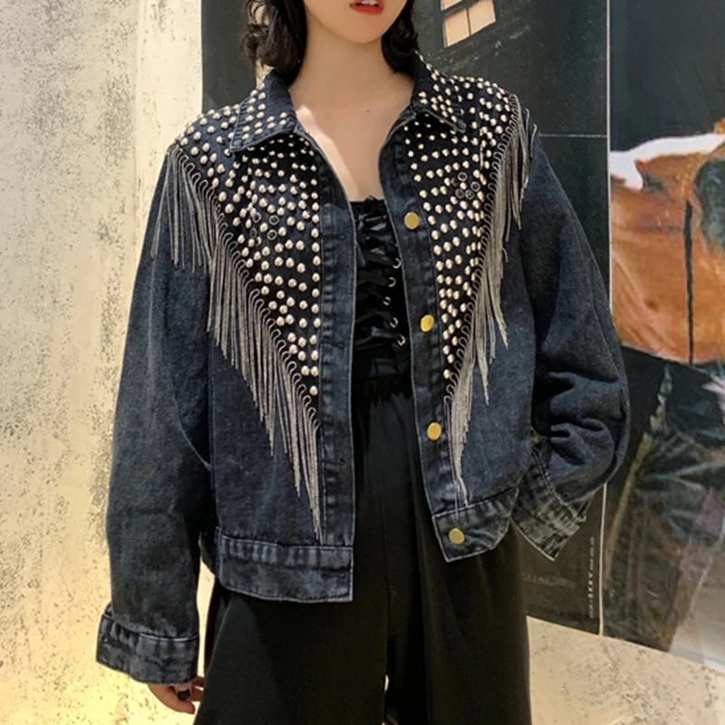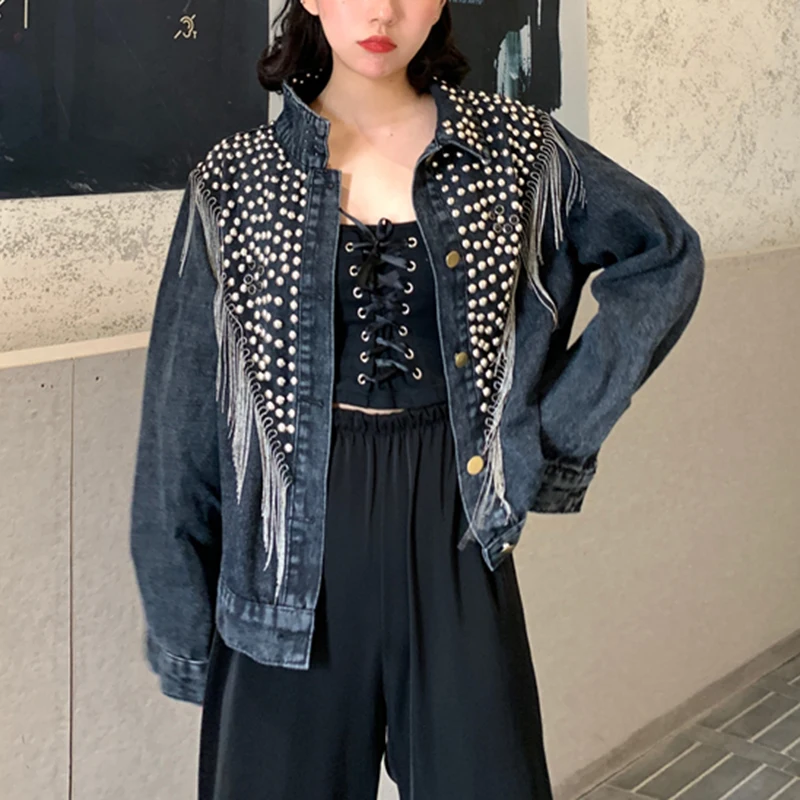 Женская джинсовая куртка PERHAPS U, синяя, черная, серая джинсовая куртка на пуговицах с длинными рукавами и отложным воротником, с карманами и заклепками, C0505