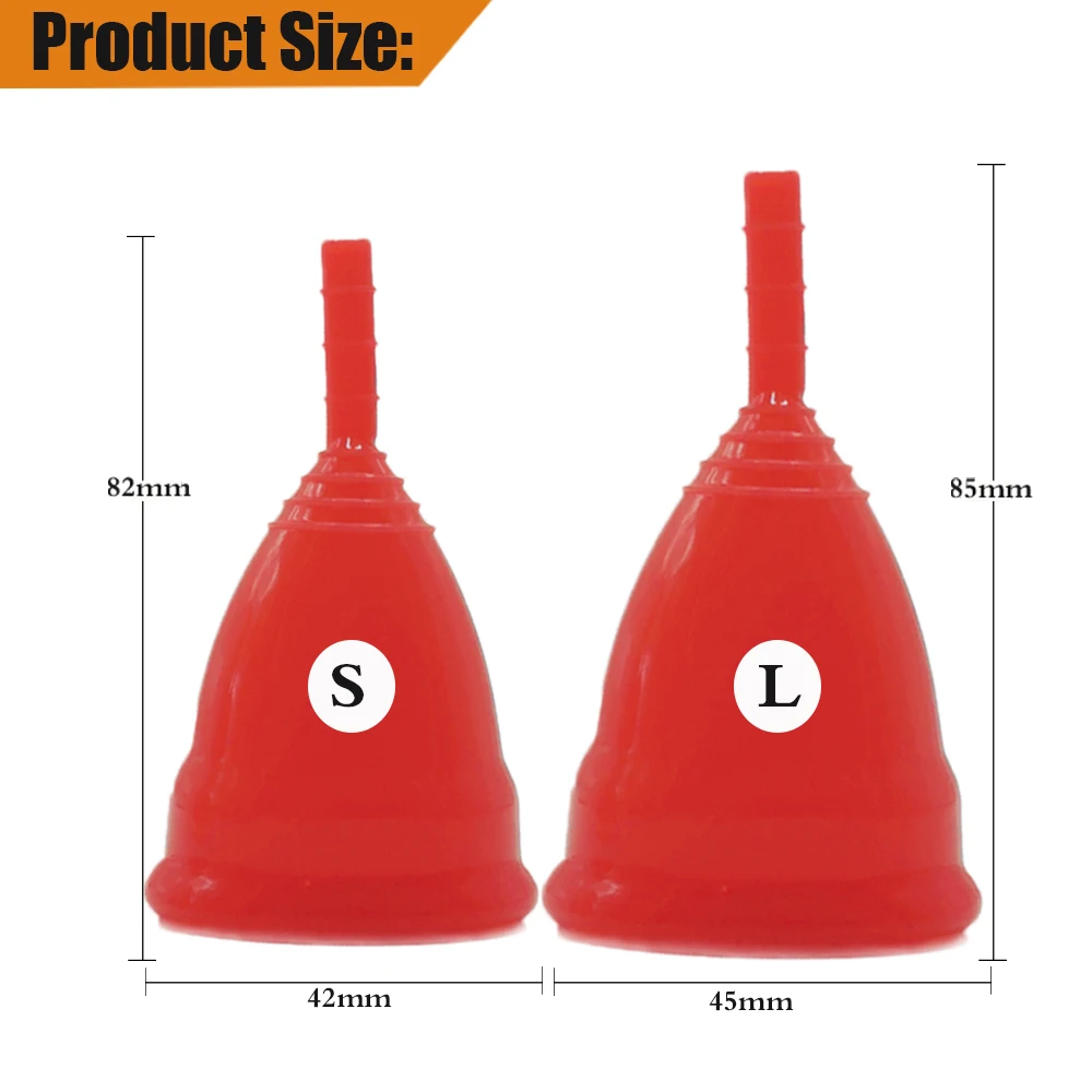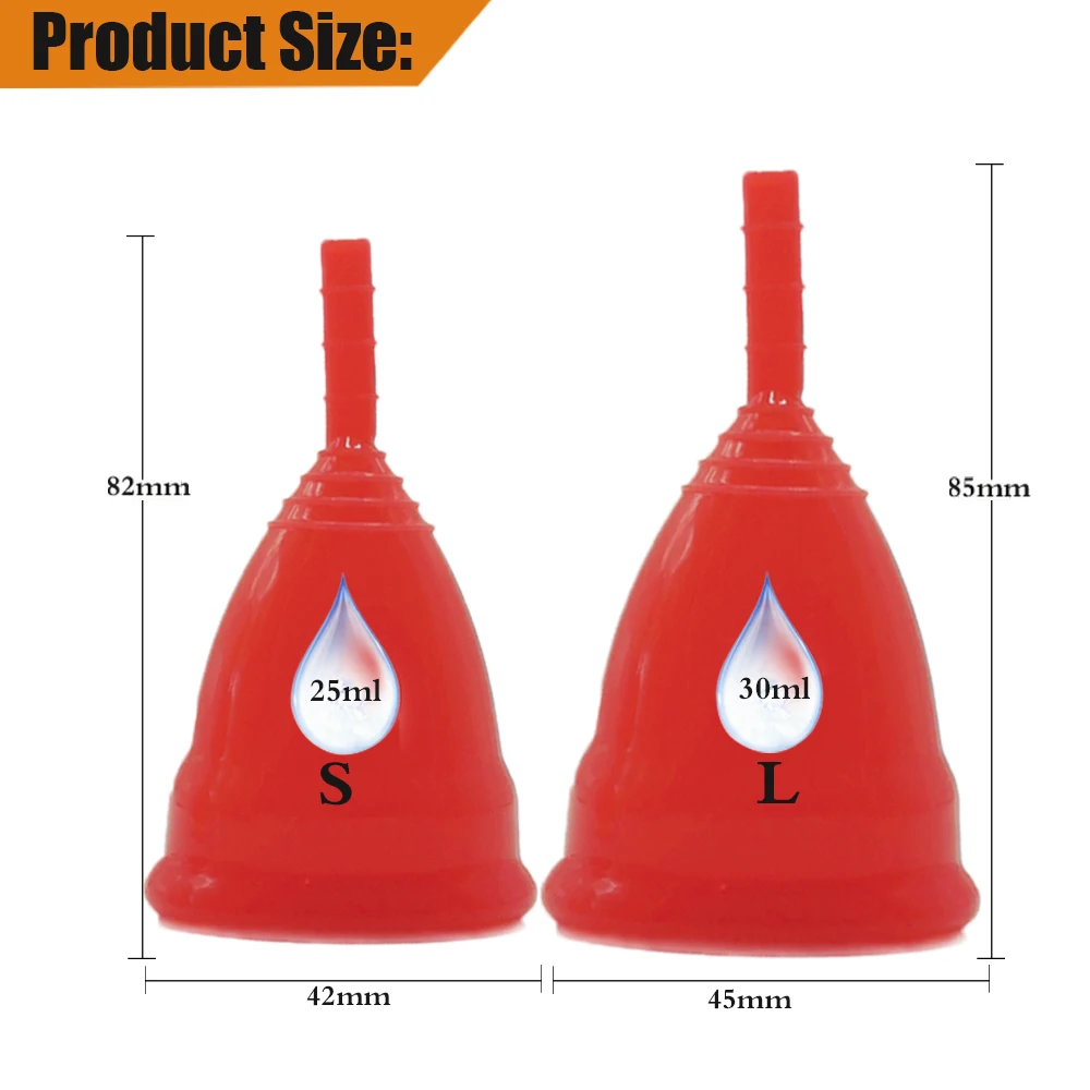Менструальная чашка размера S подходит для нормального протекания. Размер L менструальная чашка подходит для сильного потока. Мы рекомендуем вам купить два разных размера менструальных чашек для различных менструальных условий.