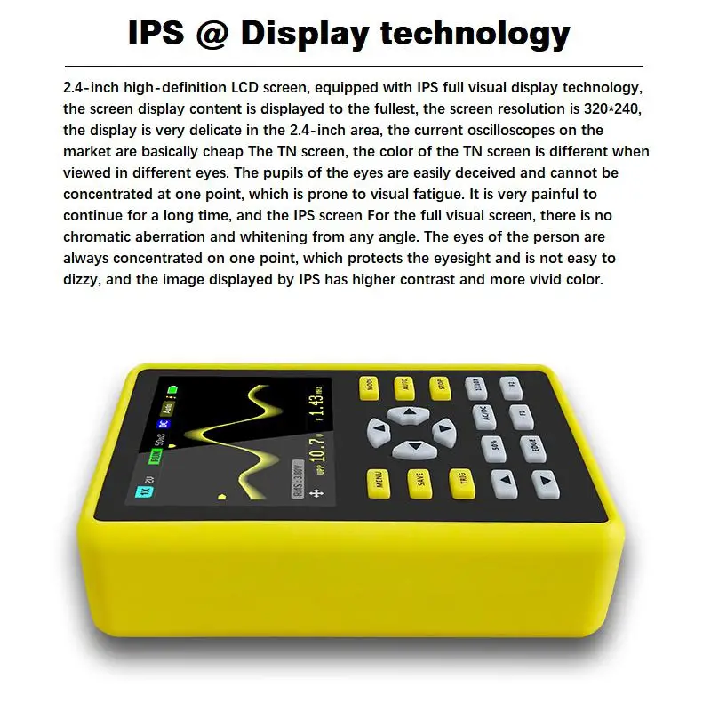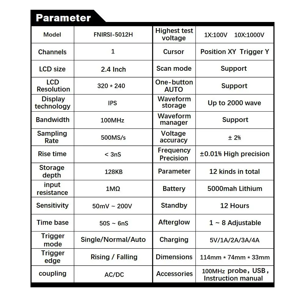 Интеллектуальная защита от ожогов, 1X выдерживает выдерживаемое напряжение до 600 В. Технология отображения после свечения. 2,4 дюймовый цветной экран с технологией TFT. С аналоговой полосой пропускания 100 МГц и частотой дискретизации 500 мс/с. (1X = 5 МГц, 10X = 100 МГц) Хранение сигналов одной кнопкой. Встроенное хранилище объемом 64 м, максимальное хранение 2000 изображений волновых форм. Мощный файловый менеджер форм, поддержка просмотра миниатюр, просмотра, просмотра деталей, перелистывания, удаления и других функций. Диапазон высокого измерения напряжения, 1 шт. может измерять 0 ~ 80 в, 10 шт. может измерять 0 ~ 800 В.:; Измерение до 12 параметров: VPP, VP, Vmax, Vmin, Vavg, Vrms, частота, обязанность, долг-, время +, время-