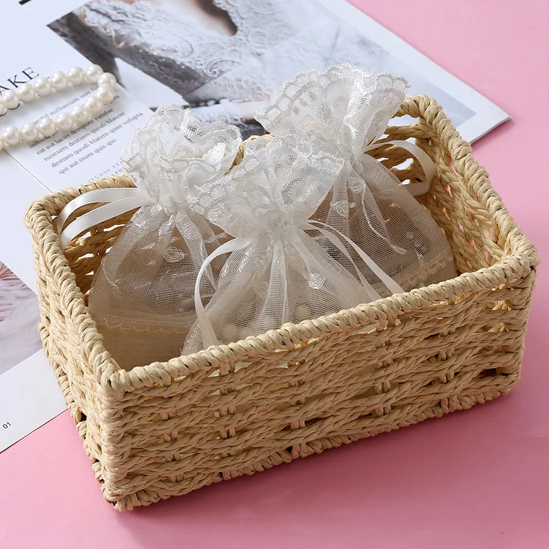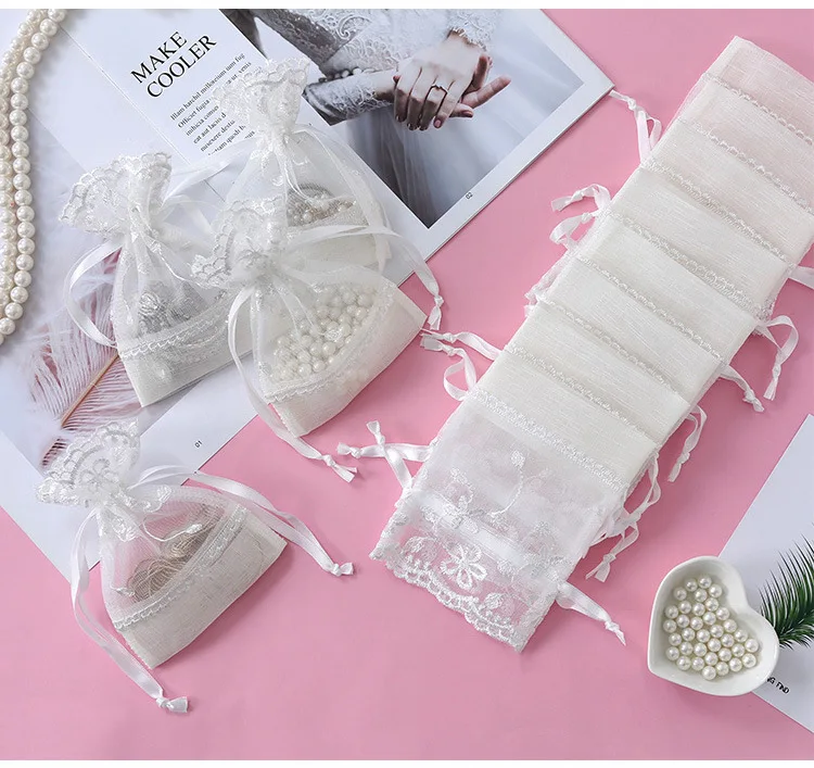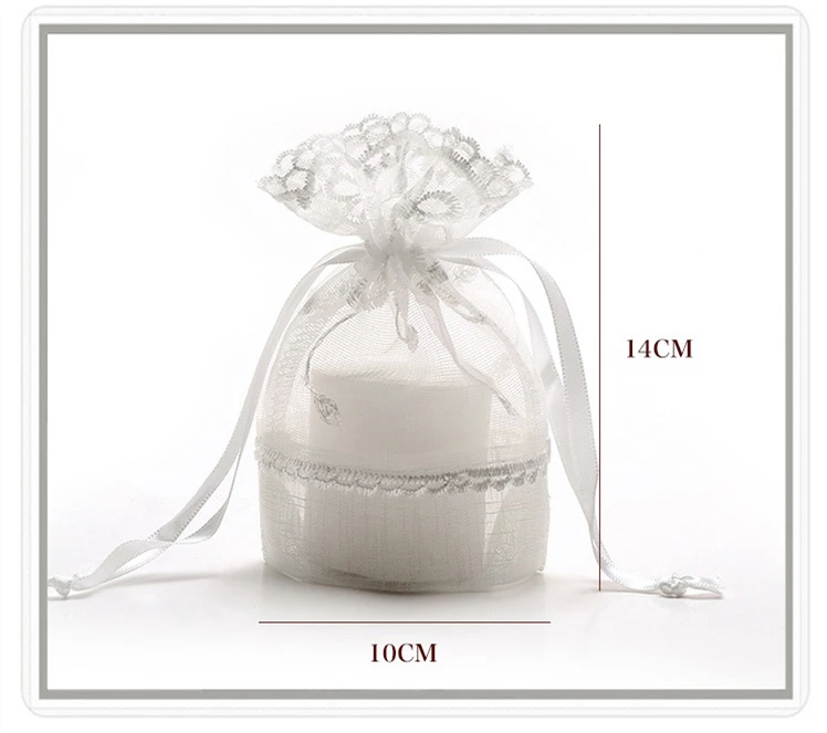Свадебный мешок для конфет, вечерние ний белый кружевной вышитый цветок, шнурок из органзы, Подарочный пакет для ювелирных изделий 10x14 см
