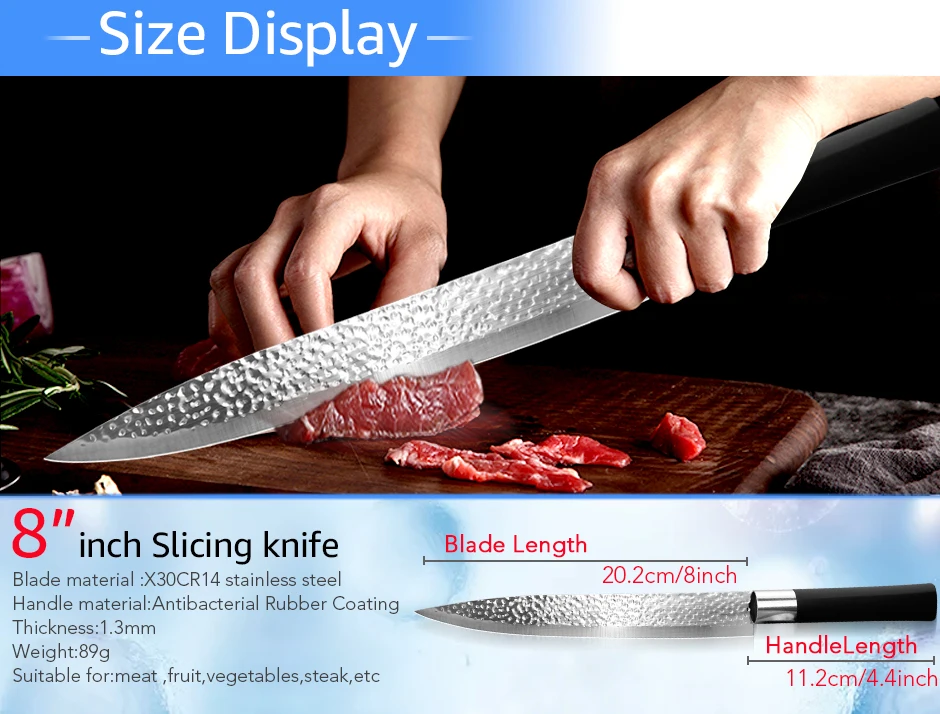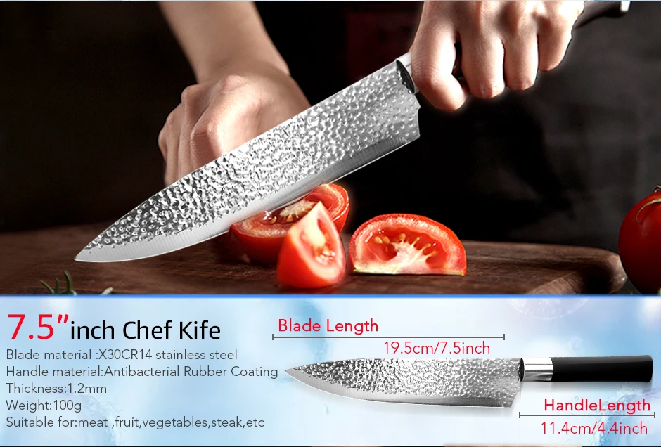 1. Материал лезвия: высокоуглеродистая Нержавеющая сталь 5CR15MOV2. Твердость лезвия: 56- 58 HRC3. Ремесло поверхности лезвия: рукоделие ручной работы4. Материал ручки: Высококачественная Нескользящая ручка из АБС-пластика + мягкое покрытие TPR* Примечание: Каждый нож имеет безопасную пластиковую крышку для ножей *