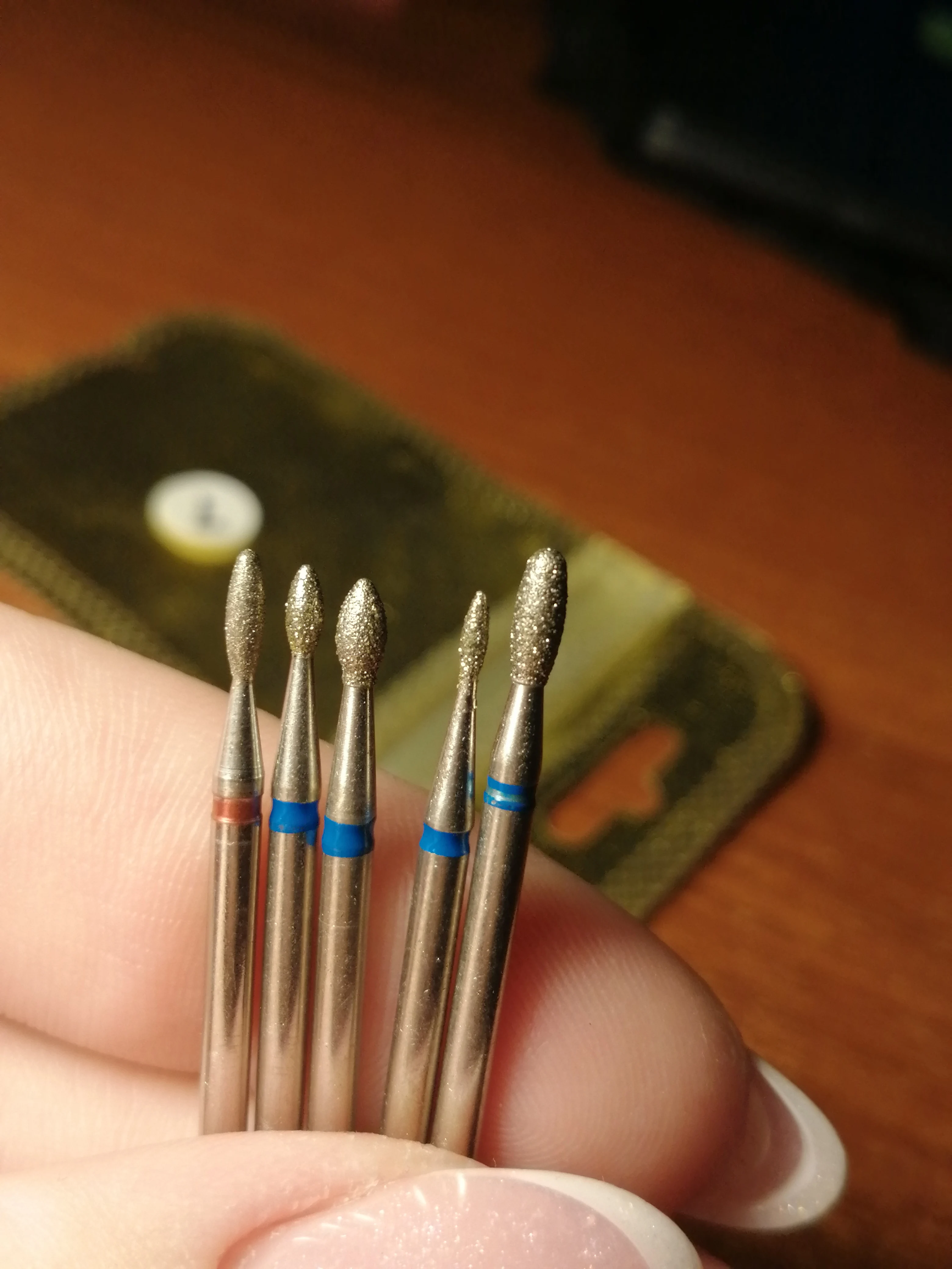 отличные фрезы. напыление нежное и бархатистое, очень приятное. хорошо центрированы, фреза не бьёт по пальцу. потестила на паре заусенцев - сошлифовала до абсолютной гладкости, заусенец ушёл полностью, при этом кожу не повредила. однозначно рекомендую.