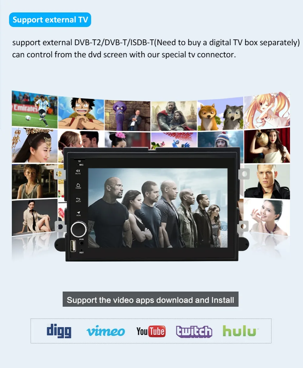 1. Емкостный сенсорный экран/разрешение HD 1024*6002. Поддержка загрузки приложений Android и Google play store3. Поддержка HD 1080P +4. Встроенный Автомобильный DVD WIFI5. Загрузите функцию телефонной книги, вы можете загрузить контактную информацию с вашего телефона на этот блок6. Поддержка управления рулевым колесом7. Функция зеркальной связи. Передача информации на экран вашего автомобильного монитора8. Bluetooth поддерживает все бренды мобильных телефонов, ввод телефонной книги, воспроизведение музыки, Поддержка поиска имени по A-Z9. Радио тюнер с RDS, 30 предустановленных радиостанций (FM: 3*6, AM: 2*6)10. Кнопочный светильник, регулируемый по цвету. 7 цветов кнопок, свободно меняйте один на другой11. Многоязычные s:OSD язык: английский/русский/французский/немецкий/испанский/итальянский/арабский/Португальский/Турецкий/тайский/Польский/иврит и т. Д. 71 язык12. Логотип Ботинка: Выберите Встроенный 50 видов логотипа автомобиля14. Встроенный микрофон15. Встроенный GPS (автономная карта)16. Поддержка Google Maps онлайн навигации, вы можете использовать GPS навигации, если вы в Интернете17. Поддержка установки обоев18. Поддержка сабвуфера/RCA19. Поддержка OBD II/DVB-T/DVR/TPMS/4G net/ DAB +/Carplay/Android auto, но аксессуары являются дополнительными, необходимо дополнительно купить