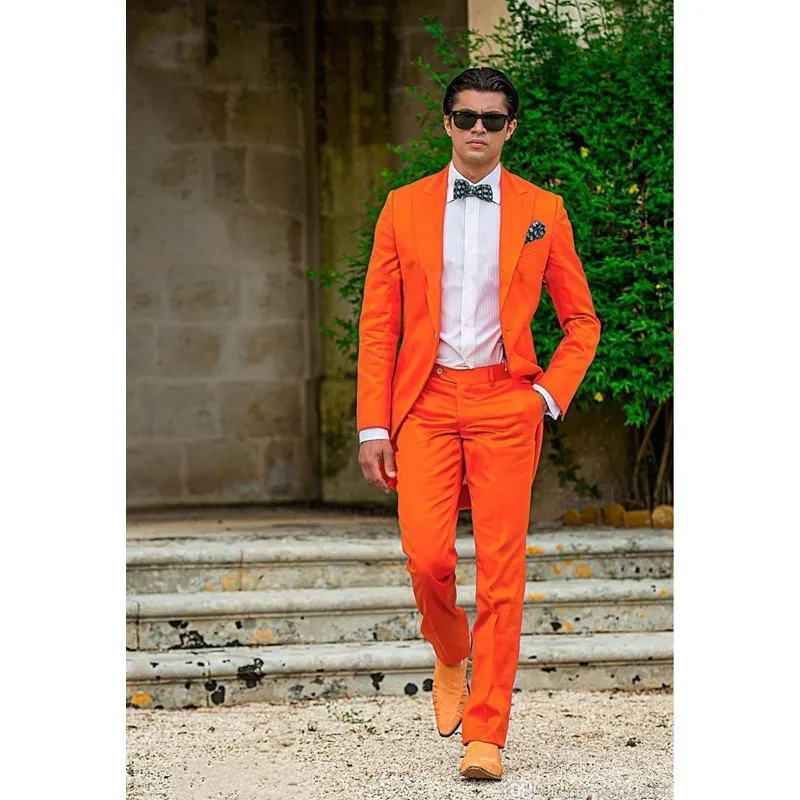 Мужской деловой костюм оранжевого фрака с острым отворотом, приталенный смокинг для жениха, Мужская Свадебная одежда, праздничная одежда для выпускного вечера (пиджак + брюки)