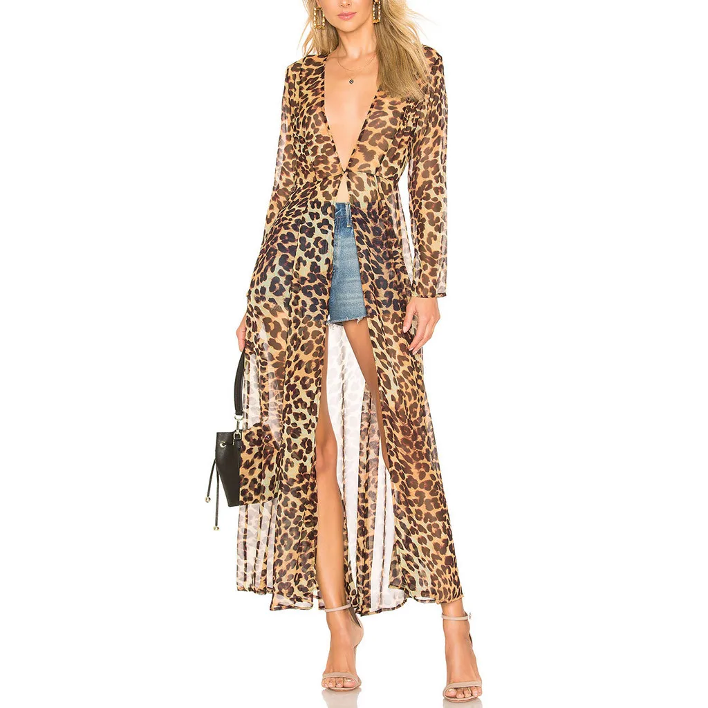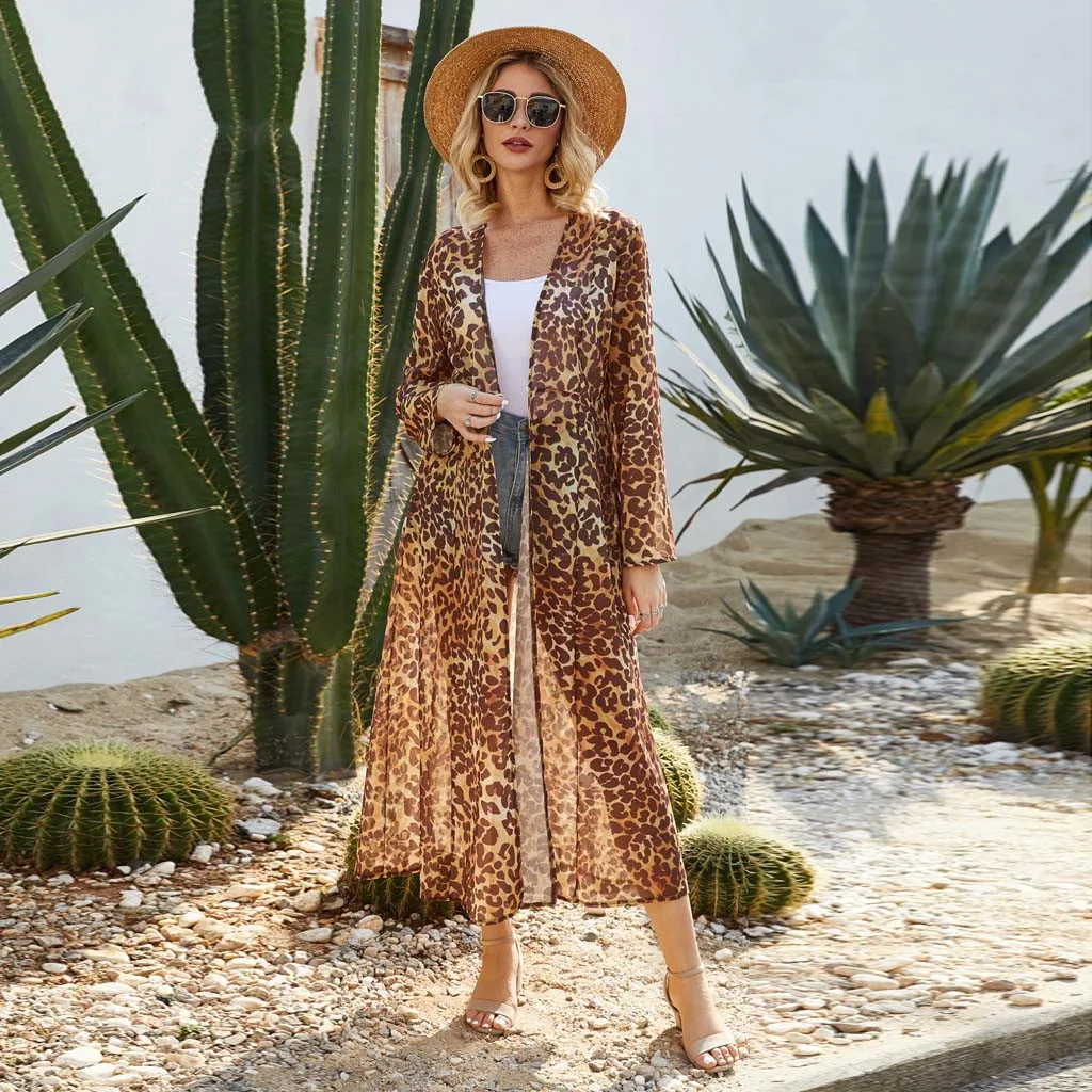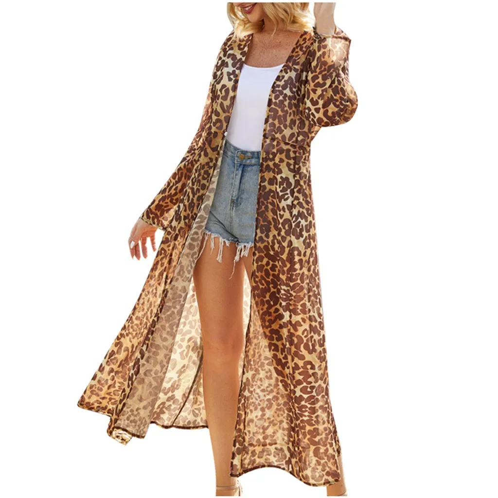 Женское шифоновое пляжное платье, с леопардовым принтом и длинным рукавом, накидка-кимоно, длинный кардиган, шаль, топы, парео, верхняя одежда # g3