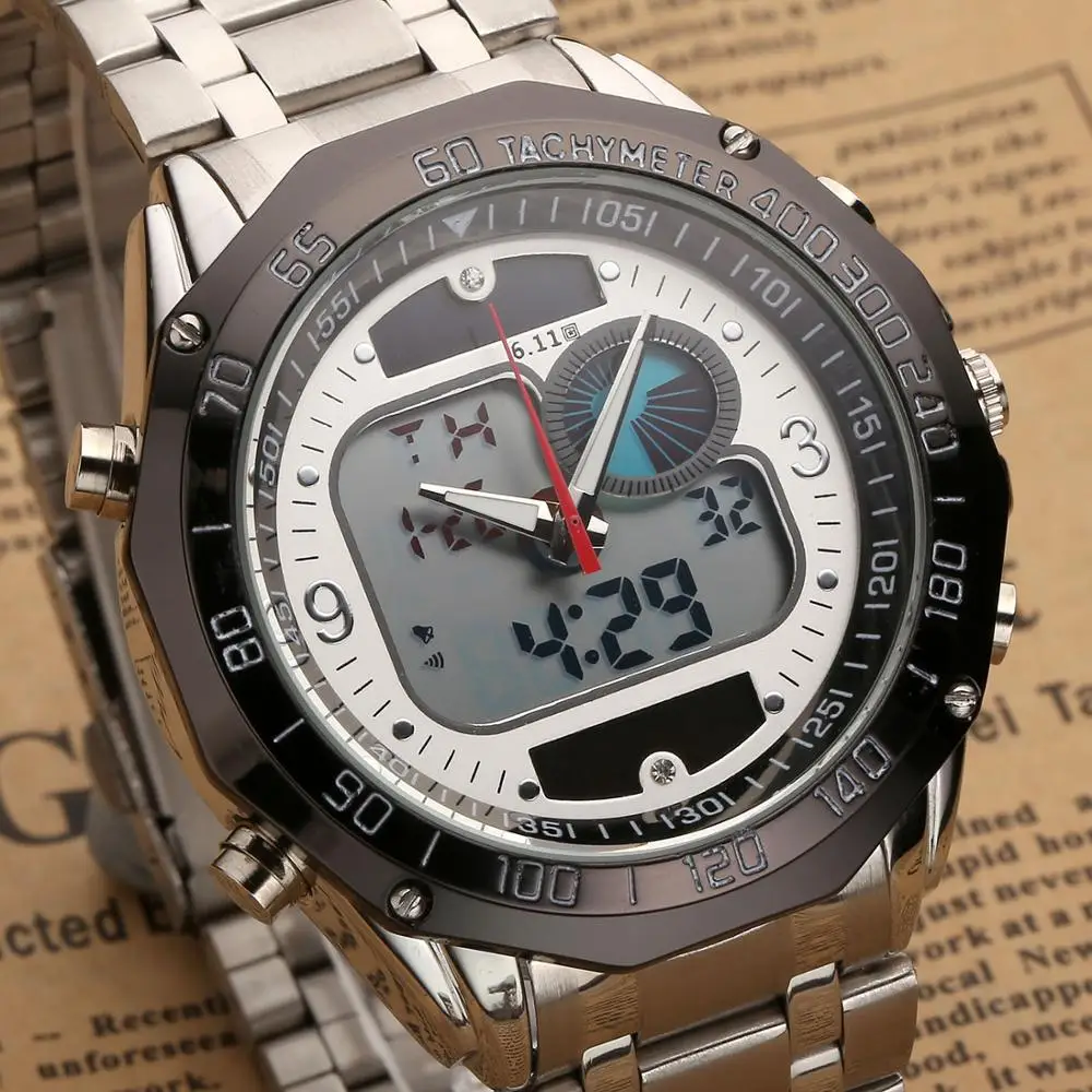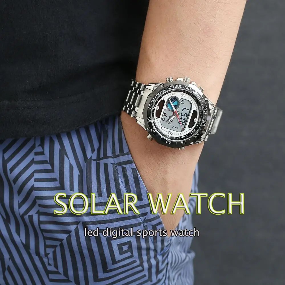6,11 мужские солнечные часы, модные двухкратные полностью стальные Двухцветные светодиодные цифровые часы, мужские водонепроницаемые часы, спортивные часы