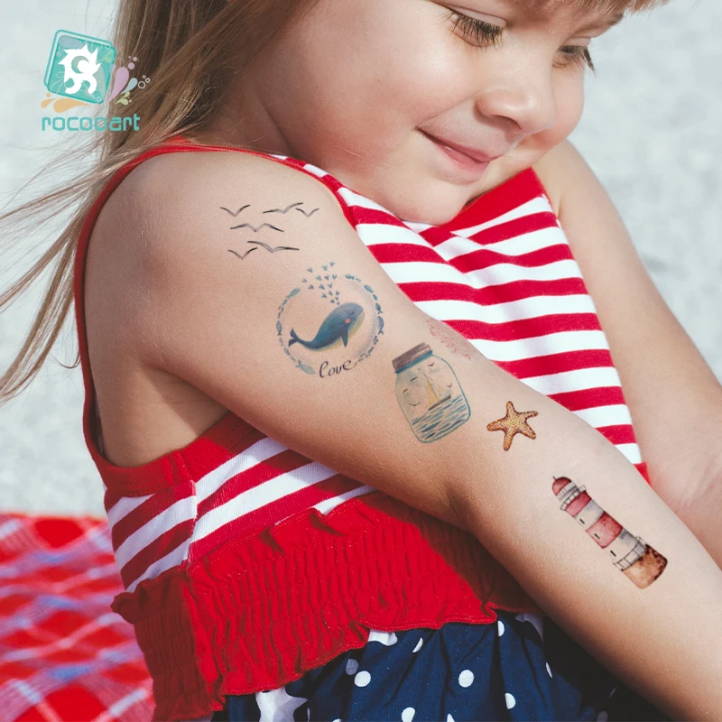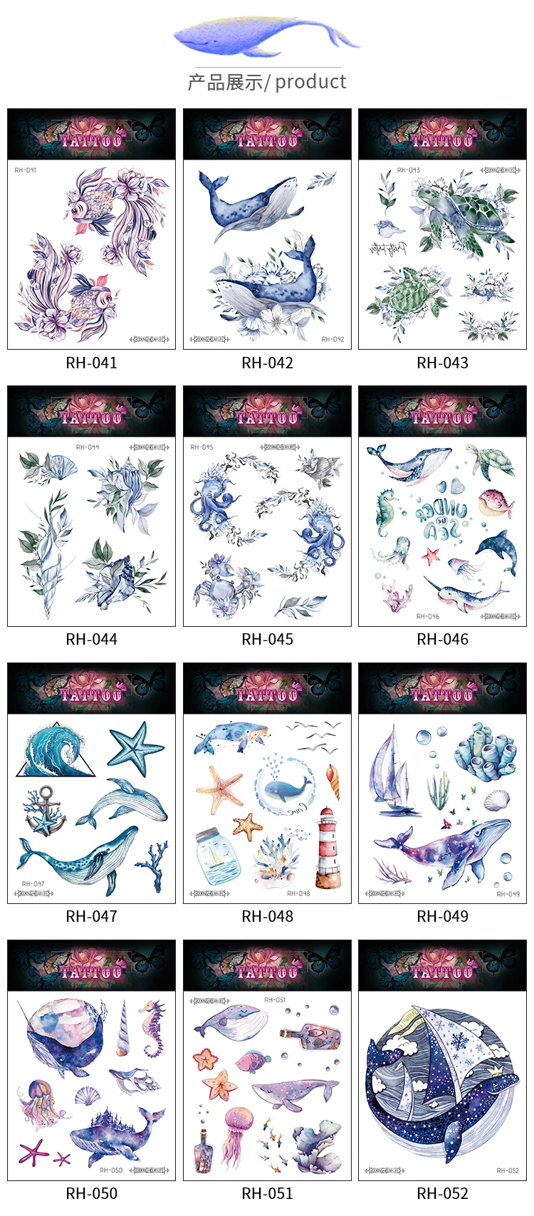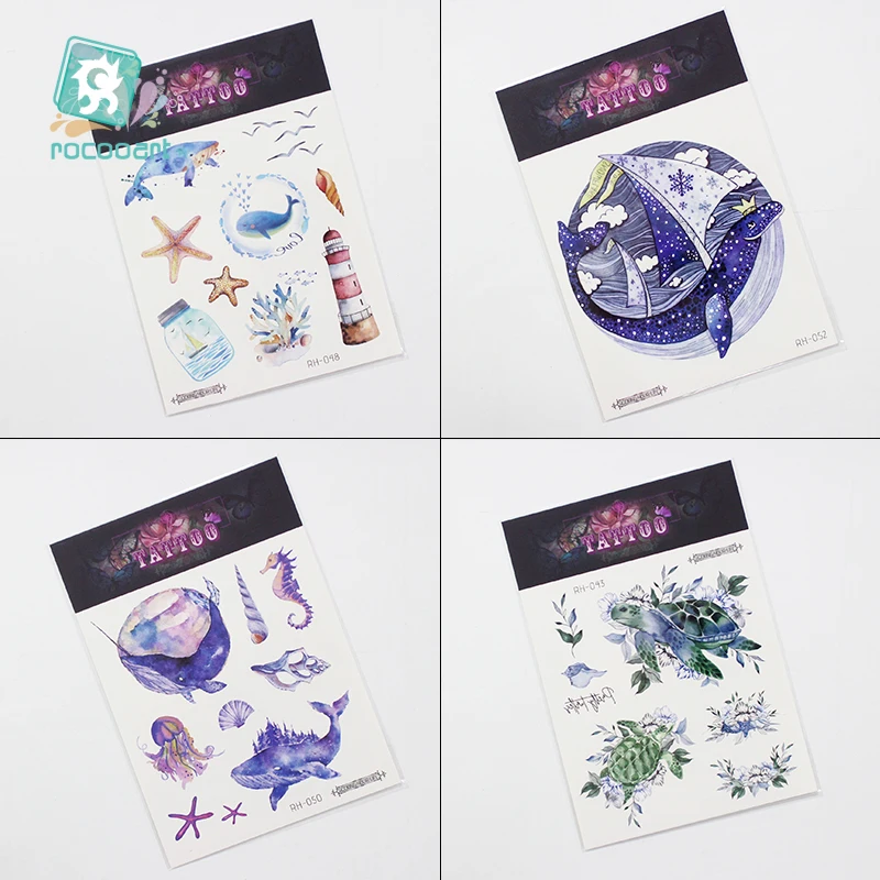 Мультяшные акварельные Временные татуировки серии океана, наклейки для детей, морская звезда, голубой кит, классные -арт, поддельные татуировки