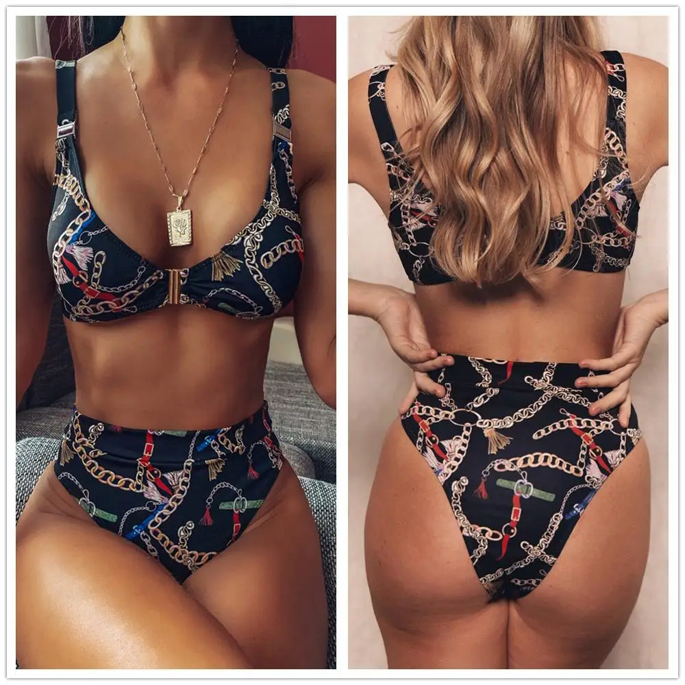 Женский комплект бикини с высокой талией 2020, купальник с золотым принтом, Женский винтажный Бразильский бикини, комплект бикини, купальный костюм