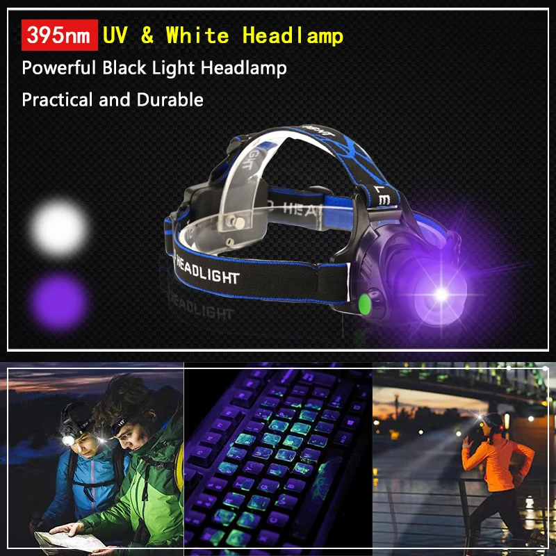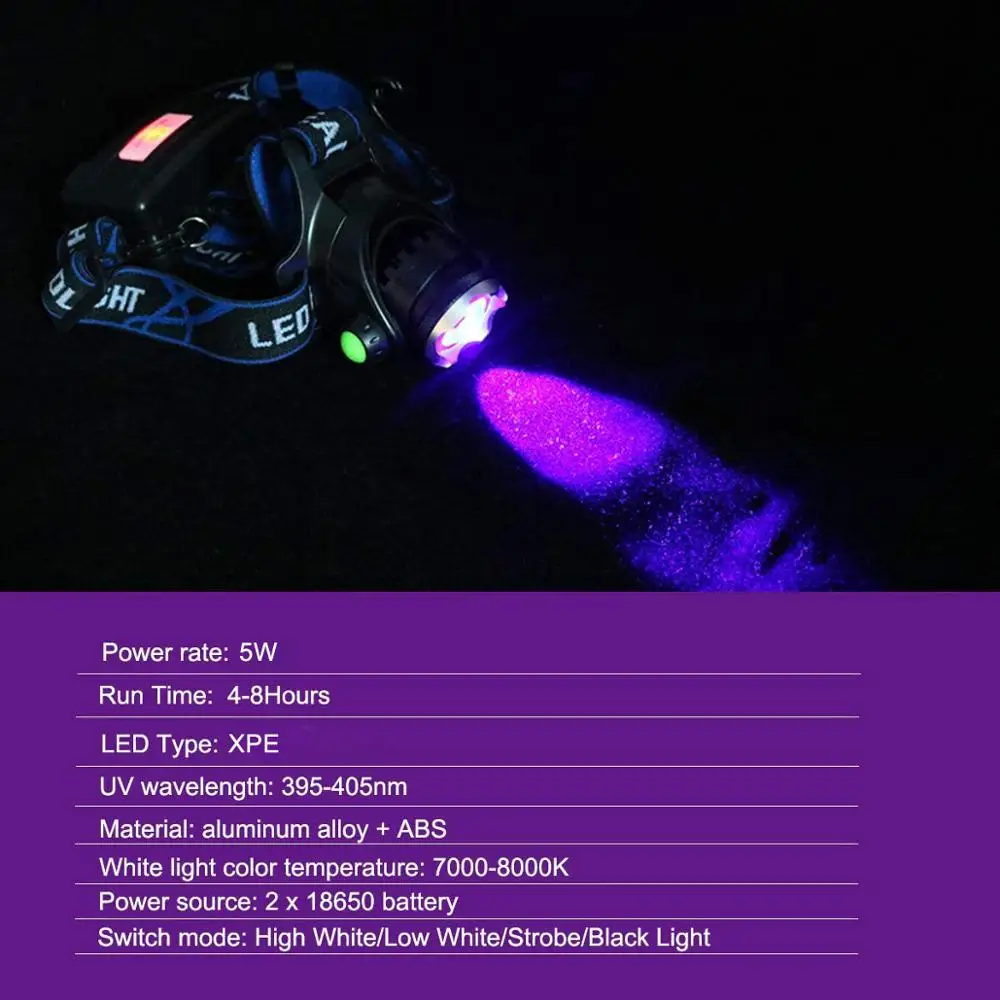 2021 Новый портативный USB Перезаряжаемый Головной фонарь с фокусировкой 5 Вт 395нм УФ-Фара 4 режима УФ и белый Головной фонарь для кемпинга охоты