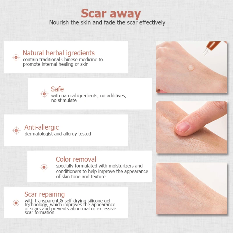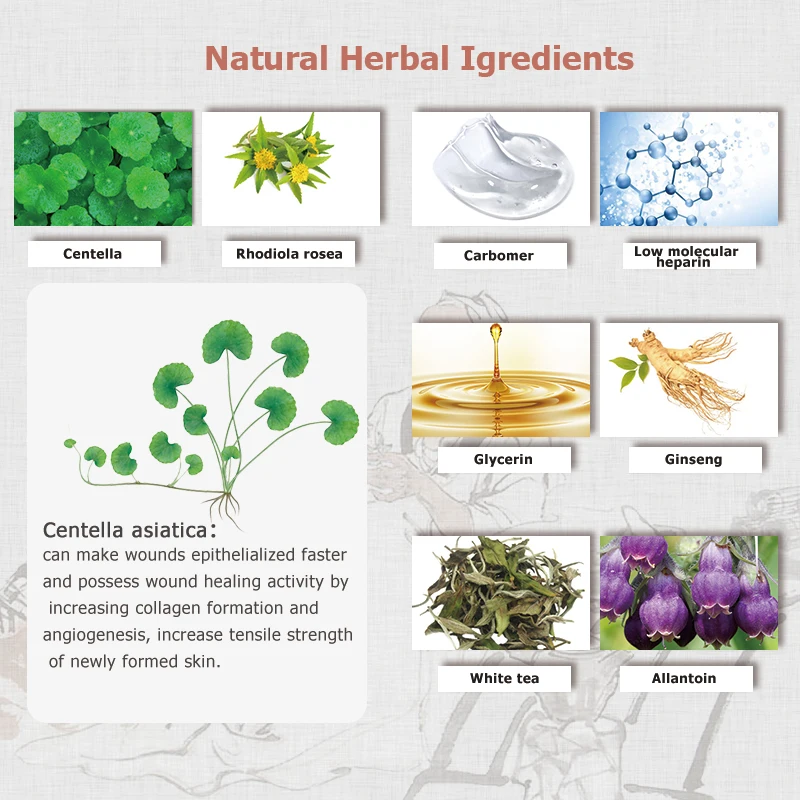 Успокаивающий аромат с уникальной растительной формулой помогает смягчить, сгладить и уменьшить внешний вид акне и шрамов, особенно для шрамов в комочках, неровности или обесцвечивания. Защита от аллергии, безопасна и эффективна для уплотнения шрамов сходства. Мягкая и гладкая поврежденная кожа за короткое время.