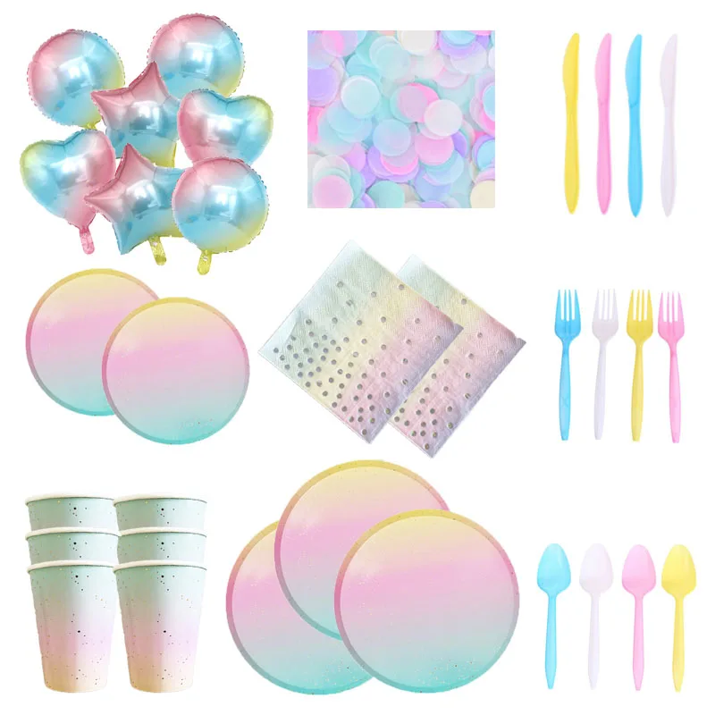 Градиент Радуга Свадебная посуда Единорог тарелка одноразовая Праздничная бумажная посуда Единорог посуда для вечеринки в честь Дня рождения воздушные шары