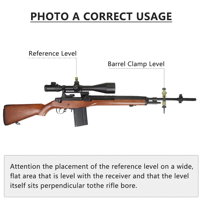 Обратите внимание на расположение опорного уровня на широкой плоской площади, которая является ровной с приемником и что сам уровень находится перпендикулярно отверстию винтовки.