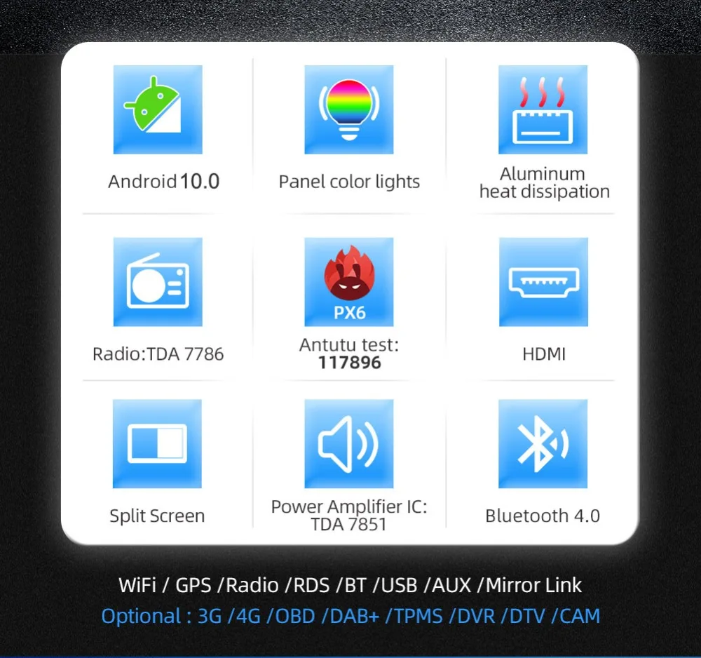 13. Встроенный WIFI; Функция GPS; Функция DVR (прямое подключение USB камеры); Функция двойного зеркального соединения; Bluetooth для мобильных рук.