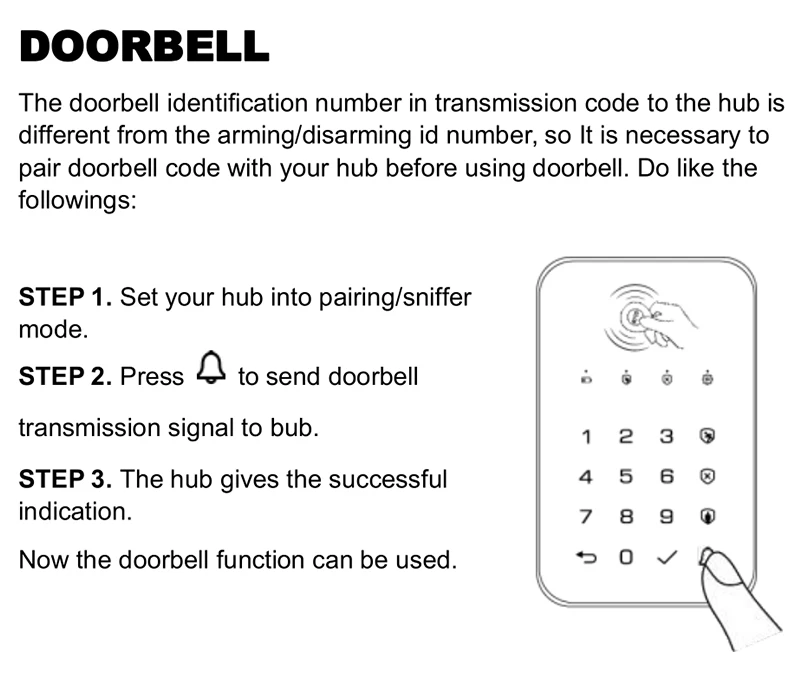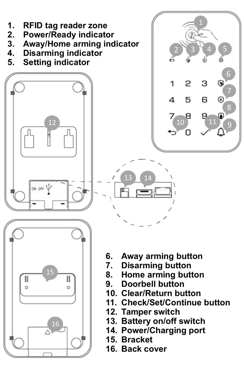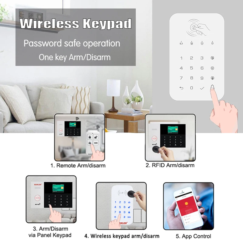 Продукт представляет собой беспроводную сенсорную клавиатуру, которая может arm и разрядить вашу систему безопасности с кодом доступа или меткой RFID. Он подключен к вашему концентратору сигнализации с помощью чипа EV1527 и частотой RF 433 МГц, с эффективным диапазоном связи до 80 метров (без препятствий). Внутренняя литий-ионная аккумуляторная батарея обеспечивает электропитание до 3 месяцев.