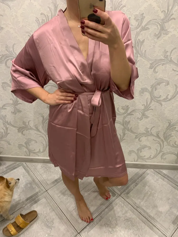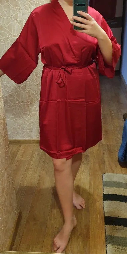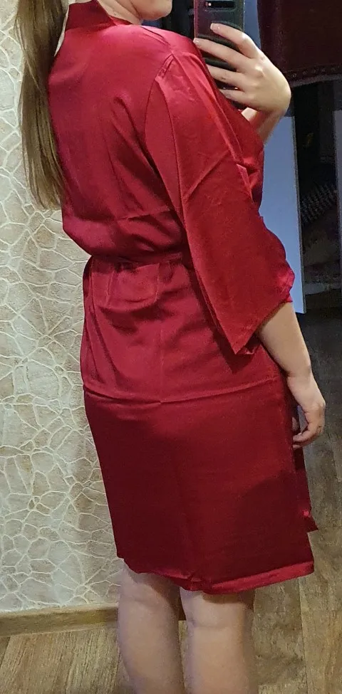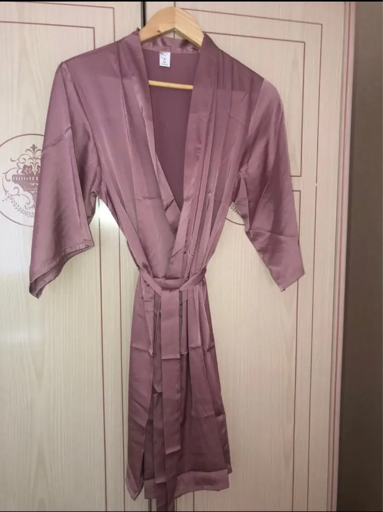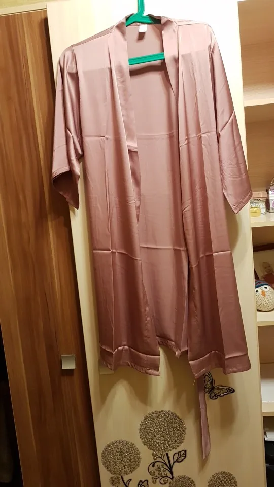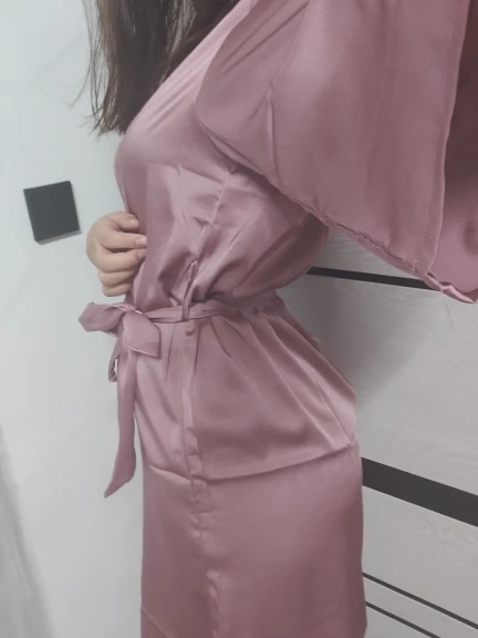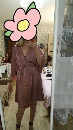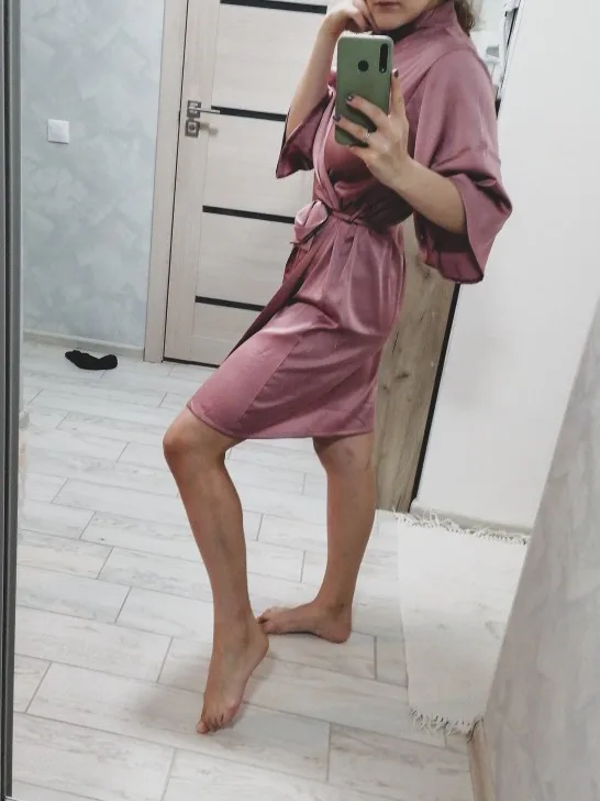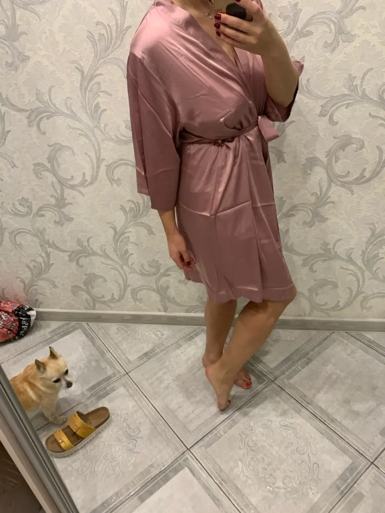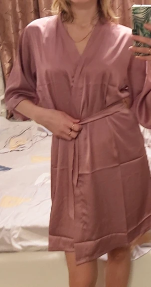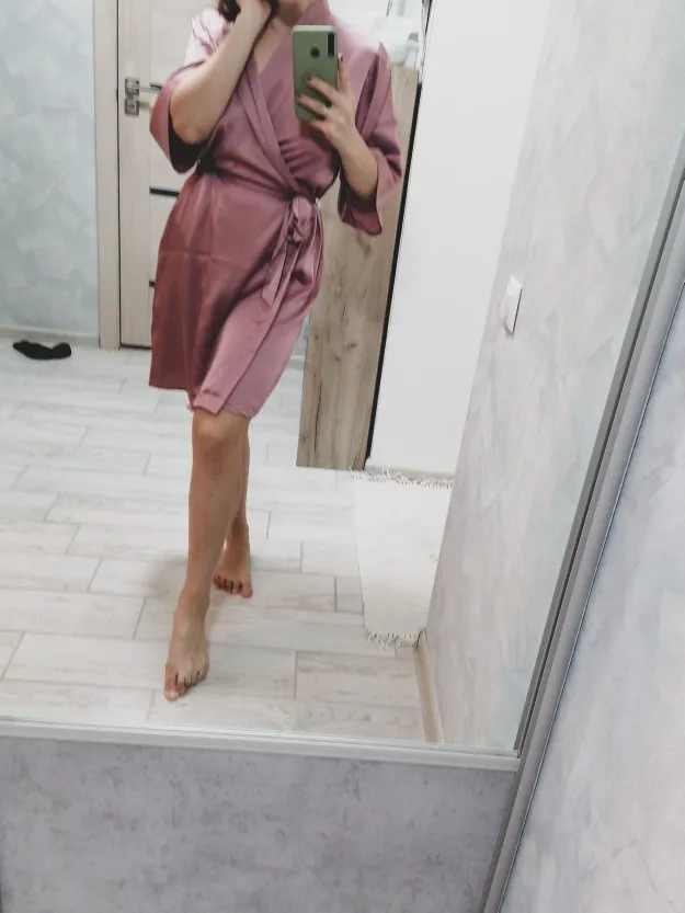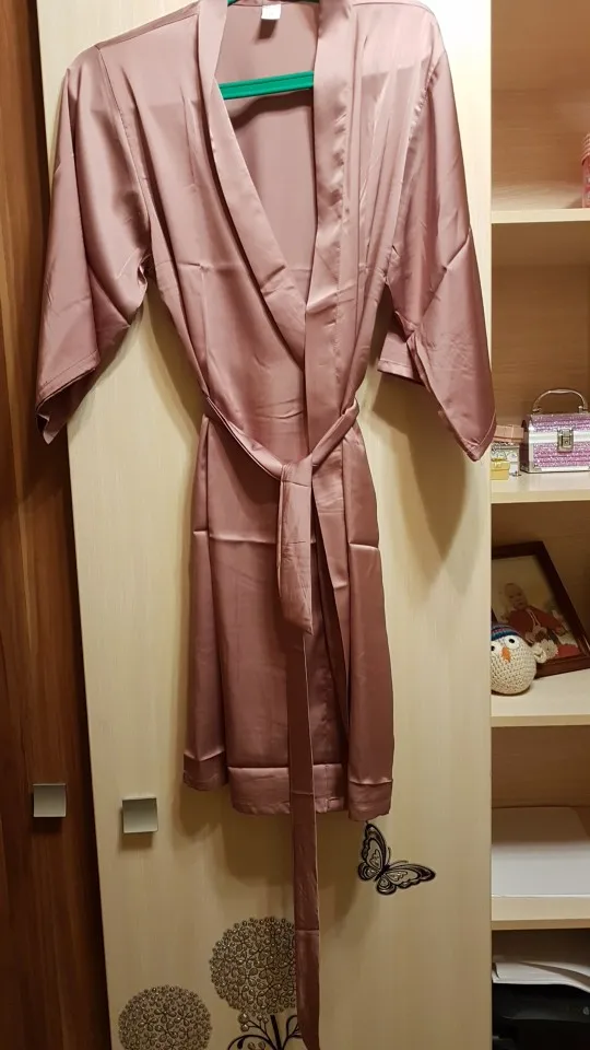 Шикарный халатик. Даже на подарок можно брать, не стыдно будет. Ткань ооооочень приятная к телу. Своих денег 100% стоит, это не дешевая ткань для халатов с али, которая похожа на облезлое что-то. Цвет красивенный- пыльная Роза. Реально класс. Есть ниточки, но не критично. На мой 42й русский (S), с объемами 83-67-90 можно было брать на размер меньше, потому что этот большеват и длина по колено. Я бы хотела повыше и более приталенный, буду ушивать.