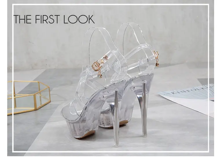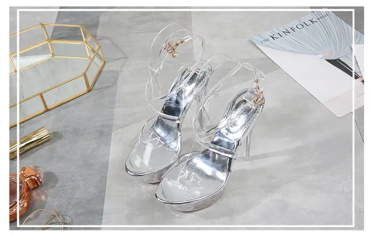 Женские босоножки; Женская модельная обувь с Т-образным ремешком; Пикантная прозрачная обувь с кристаллами; Водонепроницаемые босоножки на высоком каблуке 14 см